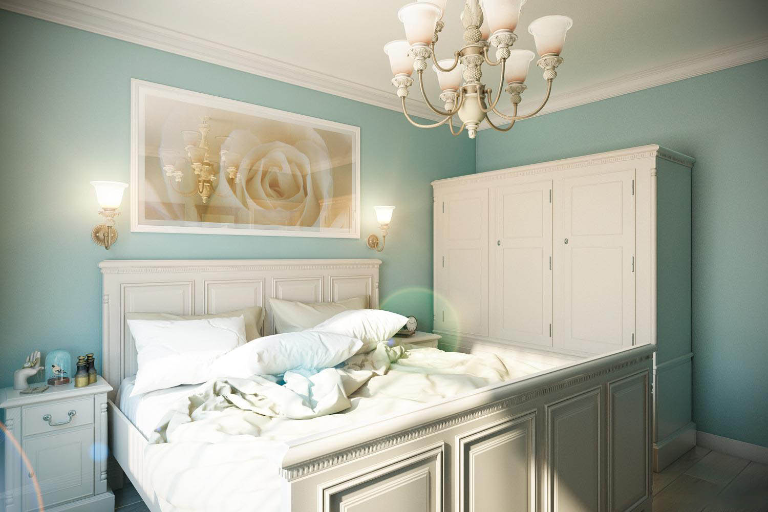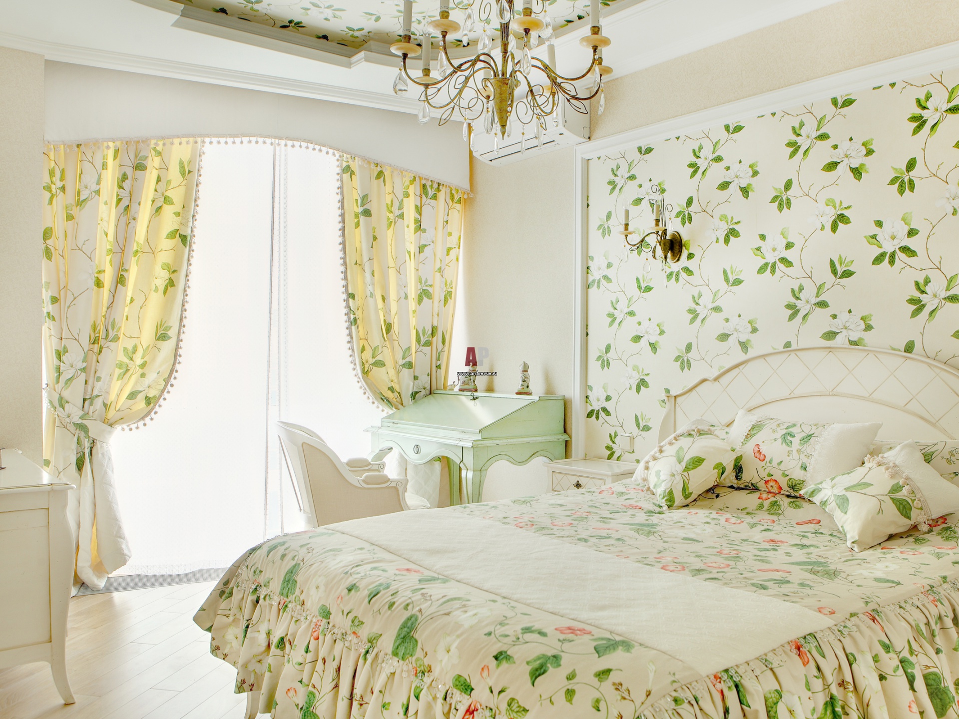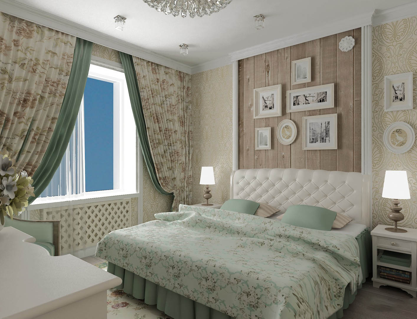 Dies ist eine moderne Version des Stils "Provence" - achten Sie nur auf das Design der Nachttischlampen.