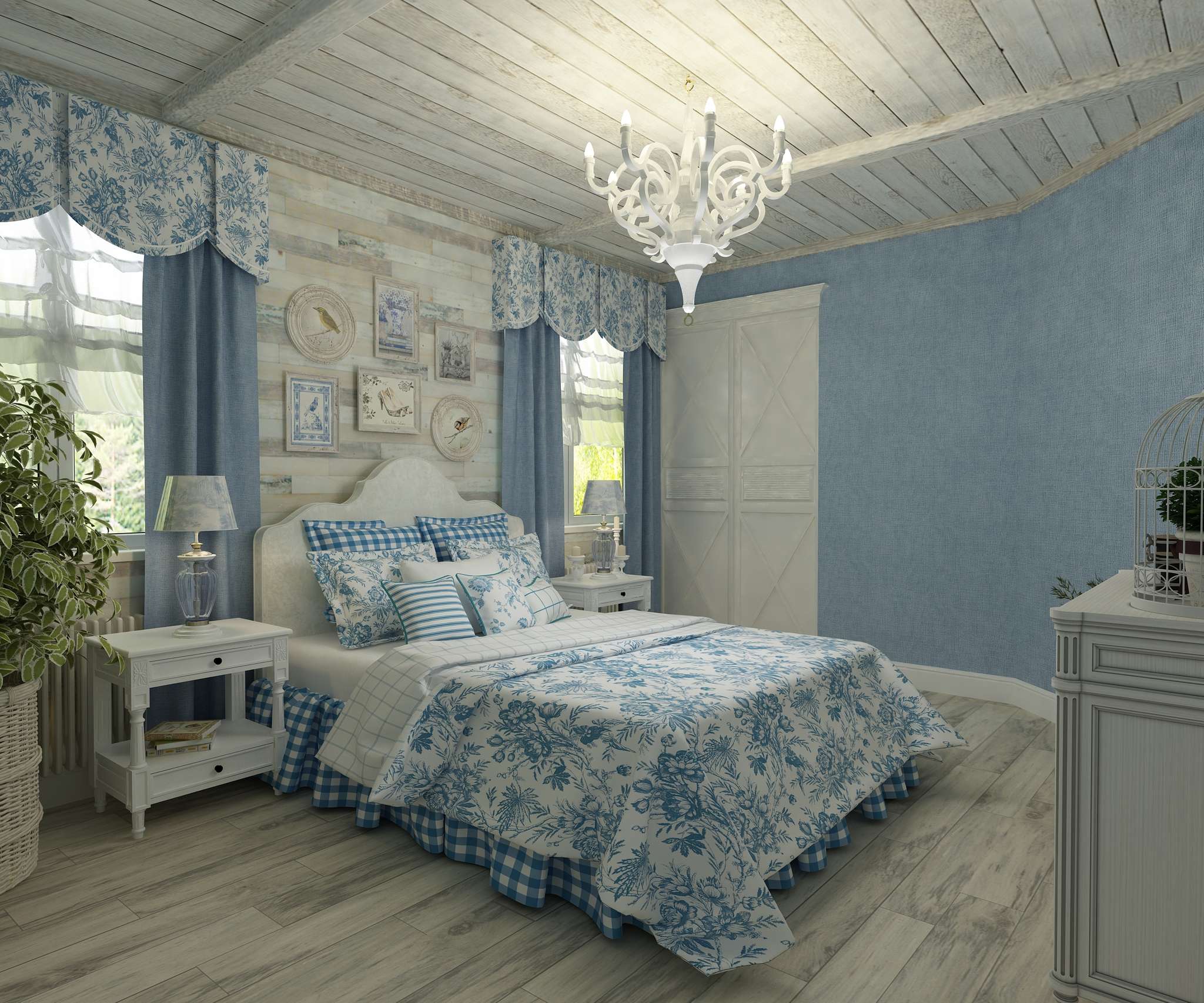 Das in Blau und Weiß gehaltene Schlafzimmer ist für einen erholsamen Aufenthalt konzipiert. Mehrere kleine florale Ornamente sind in Hellblau und Weiß gehalten. Geräumiges schmiedeeisernes Bett mit einem Baldachin zieht das Auge an. An den Seiten eines eleganten Nachttisches im Stil eines Palastes, der an Frankreich erinnert.