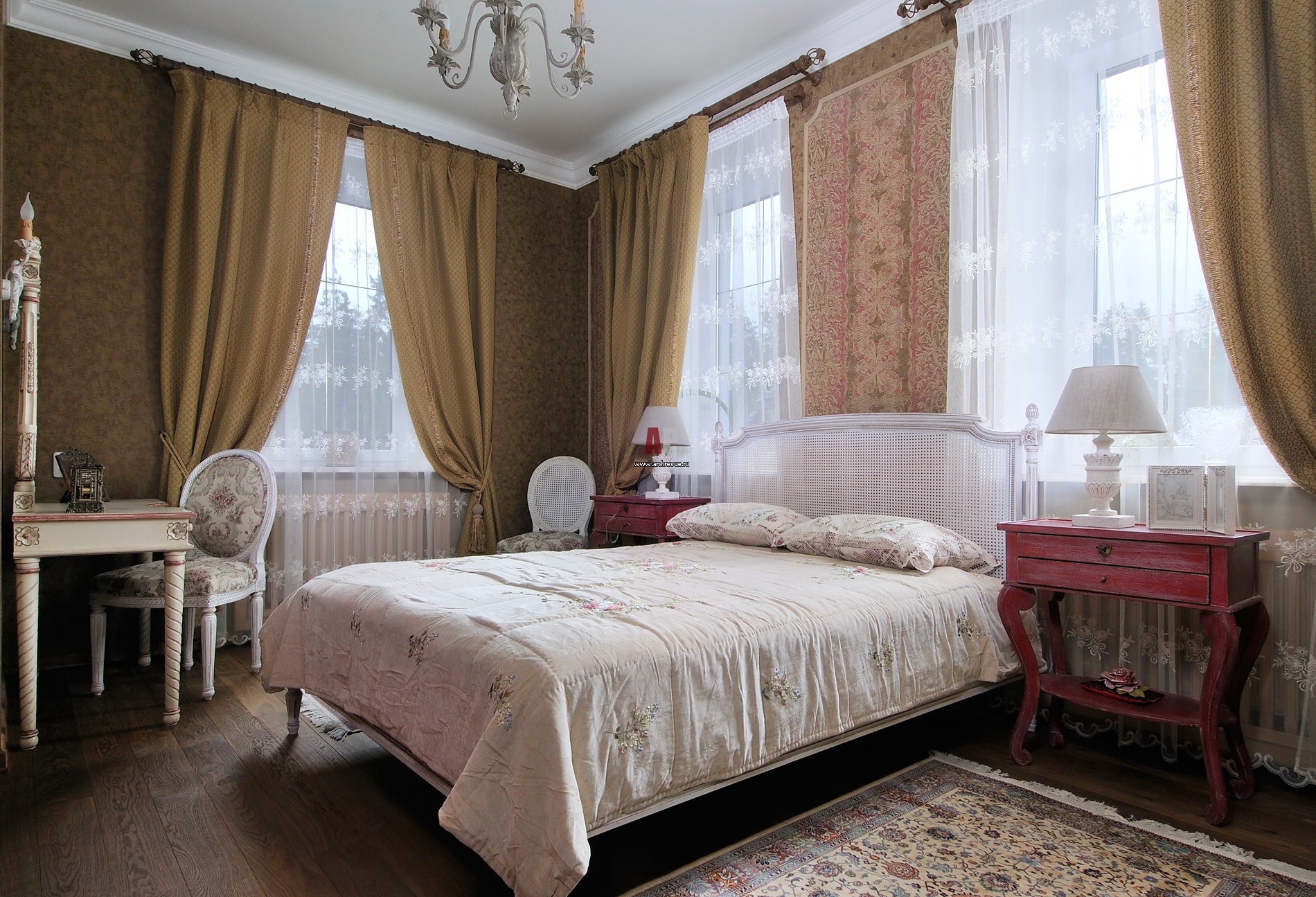 Zarte Servietten auf den Nachttischen verleihen diesem Raum einen besonderen Akzent. Der Fokus liegt auf sichtbaren Vorhängen.In der Nähe von ihnen ist ein weicher, bequemer Sessel, in dem es so gut ist, den Abend zu vertreiben.