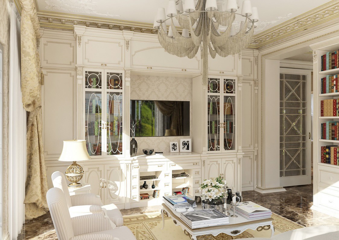 Ein Wohnzimmer in diesem Stil kann kreative Menschen, romantische Menschen, Liebhaber der Klassik und des Adels ansprechen.