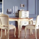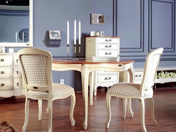 Nachdem die Tische ausgetrickst sind, nehmen wir jetzt Stühle für sie auf. Es gibt zwei gebräuchliche Optionen für das Aussehen von Stühlen im Stil der "Provence" - es können elegante Produkte auf gebogenen geschmiedeten Beinen mit weichen, gepolsterten Sitzen sein oder sie können massiv sein, ganz aus Holz, meistens sind sie mit dekorativen Schnitzereien und Gemälden verziert. Für die Weichheit können speziell genähte kleine Polster auf solche Stühle gelegt werden.