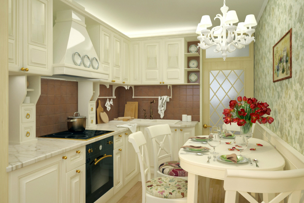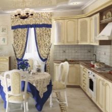 - Textilzubehör. Tischdecken, Servietten, Vorhänge, Küchentücher - alles aus natürlichen Stoffen, vorzugsweise Baumwolle oder Leinen. Solche "ländlichen" Drucke wie ein Streifen, eine Zelle, eine Blume sind willkommen. Besonderer Chic zu Ihnen nach Hause wird Zubehör mit handbestickt, mit Spitze oder Zopf umhüllt;