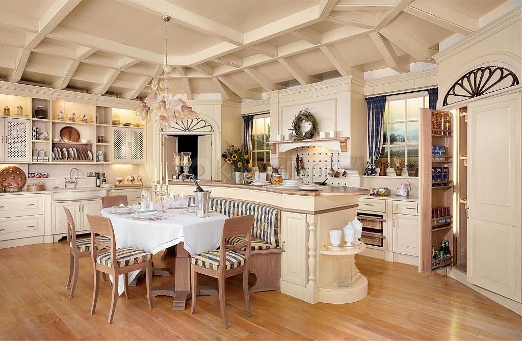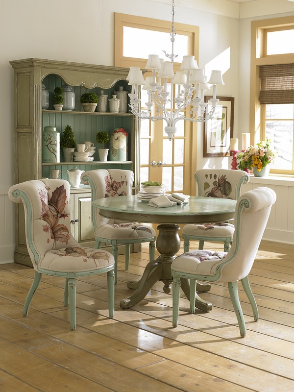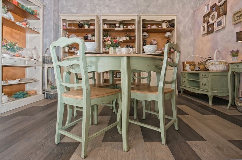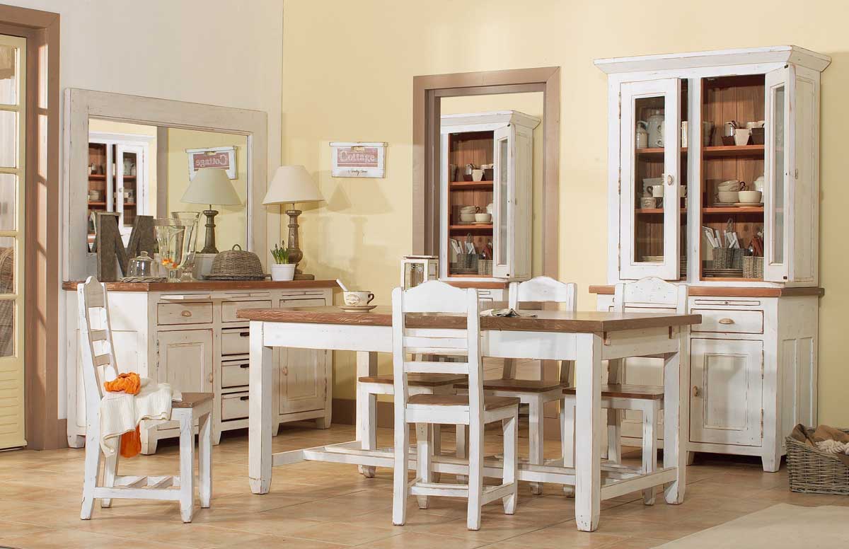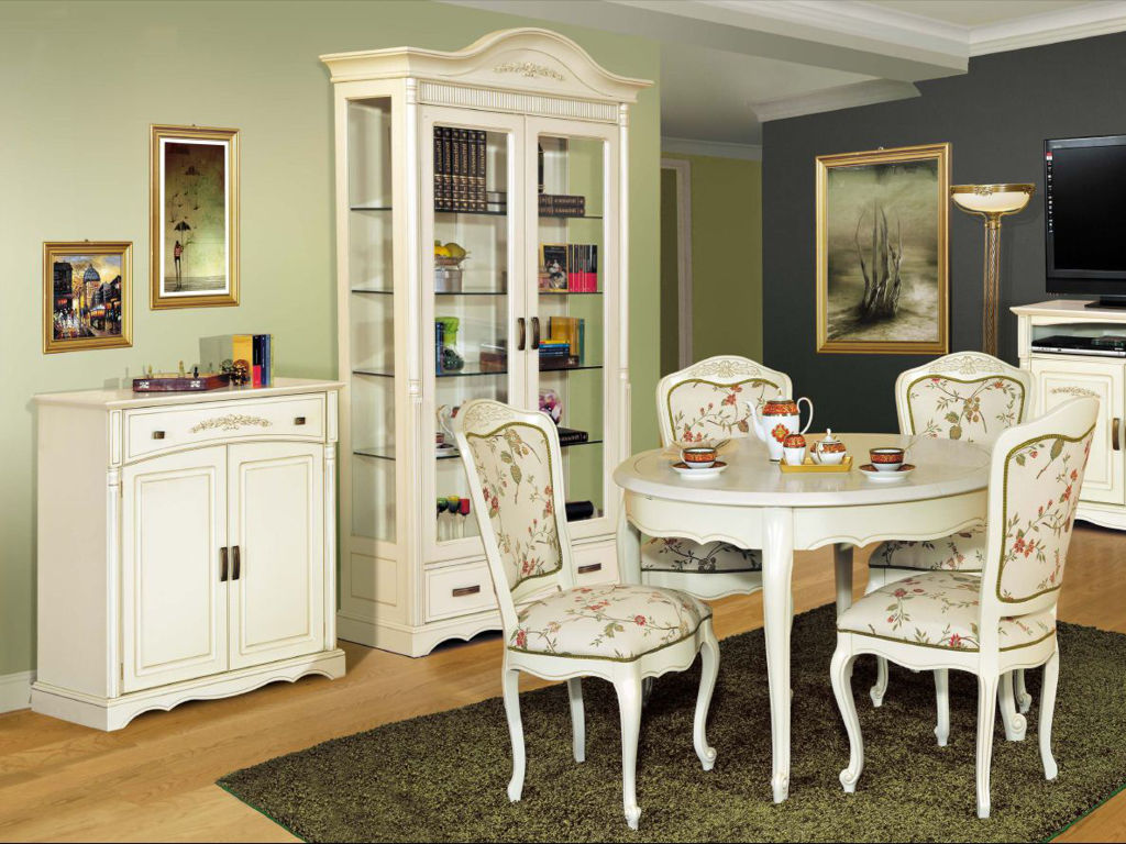 Die besondere "Dorf" -Atmosphäre dieses Stils erfordert die Einhaltung bestimmter Regeln, denen das Aussehen der Möbel folgen muss.Sie muss einen Vintage "gealterten" Look haben, muss tragen, kleine Risse, sogar angeschlagen. Geschmiedete Elemente, Schnitzereien, handbemalt sind zulässig und sehr erwünscht. Es ist auch notwendig zu beachten: