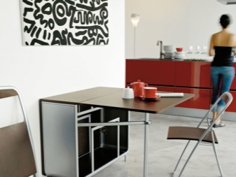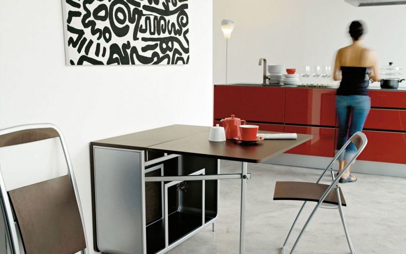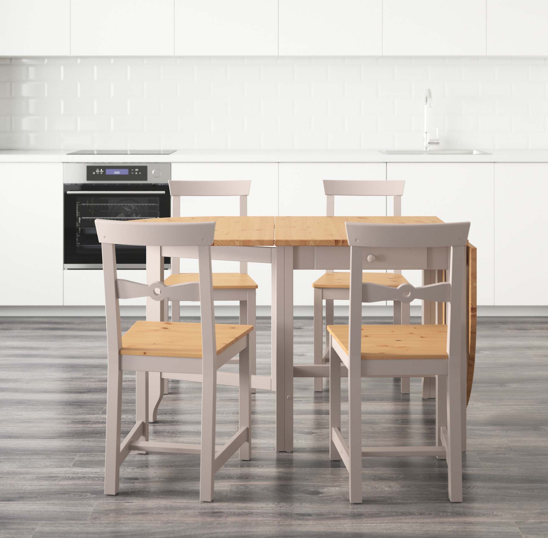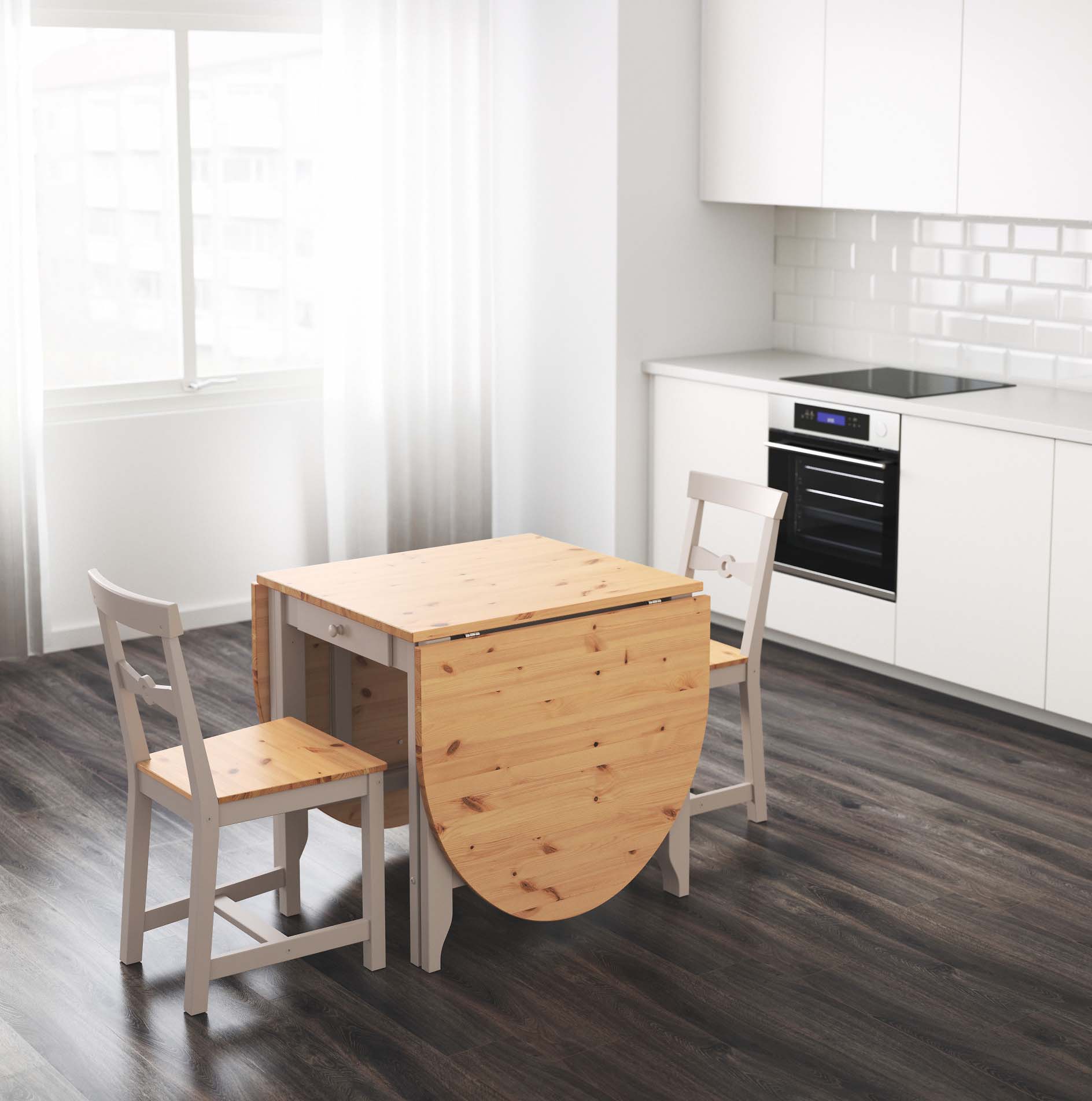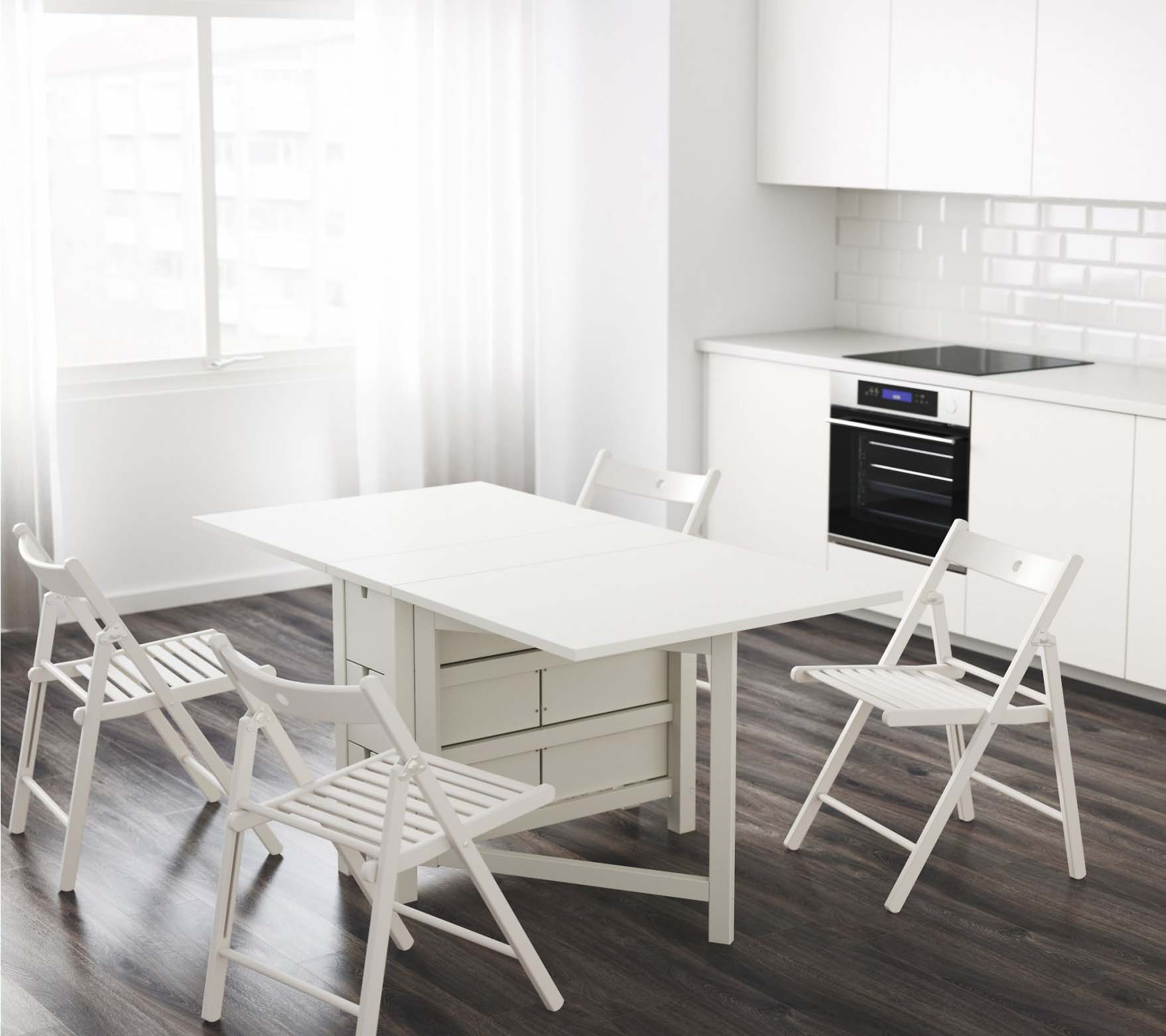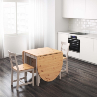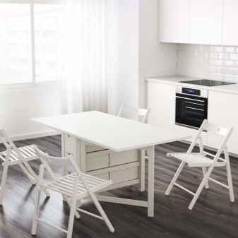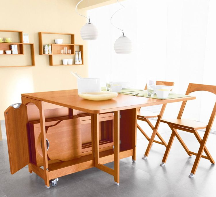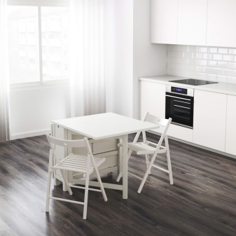 - Zimmer Die Wahl des Modells hängt auch vom Zweck des Raums ab, in dem Sie dieses Attribut platzieren möchten. Also für die Küche Das Gambleby-Modell, das einen eher breiten stationären Teil hat, ist perfekt. Dahinter können Sie die beiden sicher unterbringen, ohne zu falten. Wenn Sie die gleichen Seitengitter werfen, erhalten Sie einen großen Esstisch für 6 Personen.Unter der feststehenden Tischplatte befindet sich eine praktische Schublade, in der Sie Besteck aufbewahren können.