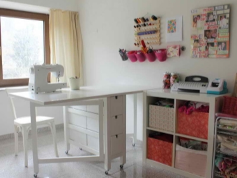 - In der Werkstatt eines solchen Möbels ist es praktisch, nicht nur auf einer Schreibmaschine zu schreiben, sondern auch Muster zu machen, und seine weiße Tönung passt in jedes Farbschema des Raumes.