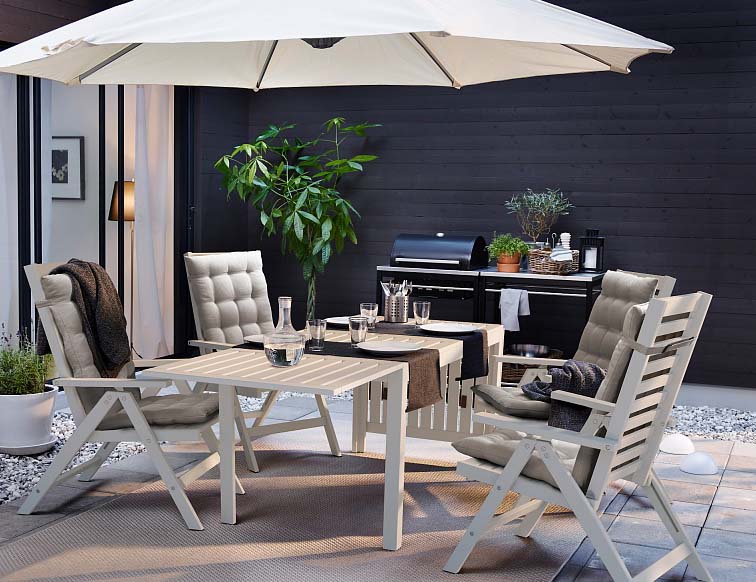 Das Farbschema der Tabellenbücher von Ikea ist eher dürftig und hat nur wenige Schattierungen. Hier finden Sie Modelle von weißen, schwarzen Farben und auch den Ton von natürlichem Kiefernholz - antik. Und für den Gartentisch können Sie einen dunkelbraunen Farbton wählen.