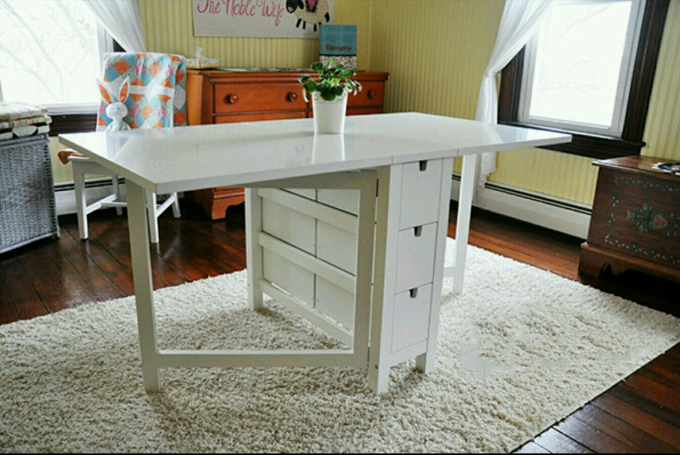 - Im Wohnzimmer Sie können problemlos einen schmalen Klapptisch "Norden" aufstellen. Dieses Modell nimmt im zusammengeklappten Zustand nicht viel Platz in Anspruch, passt sich leicht an die Wand an und kann als Ablage für Zubehör verwendet werden. Ohne sich von deinem Platz zu entfernen und die Hälfte zu verteilen, bekommst du einen Arbeitsplatz für Handarbeiten oder Schreiben. Setzen Sie dieses Attribut in die Mitte des Raumes und werfen Sie beide Seitenteile ab, so können Sie den festlichen Tisch für 6 Personen decken.