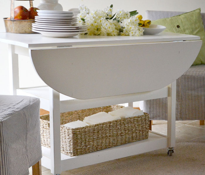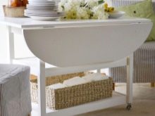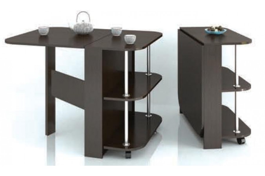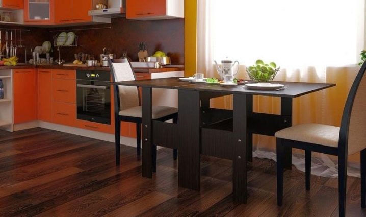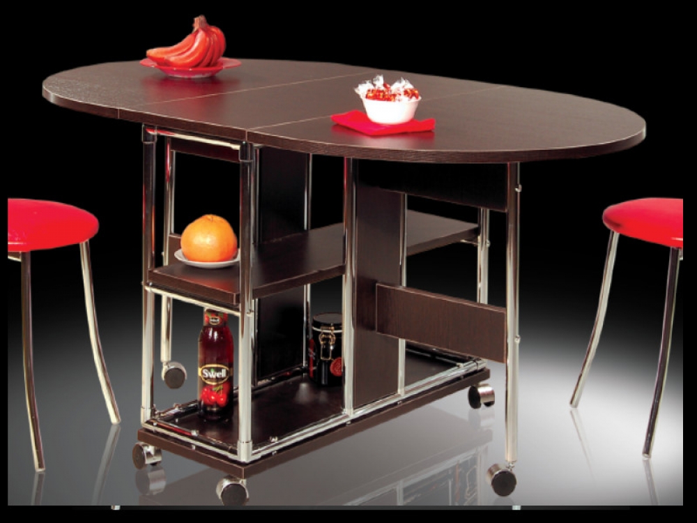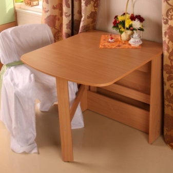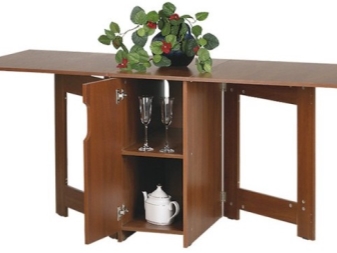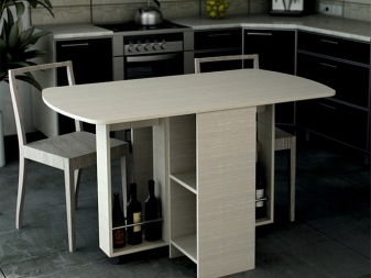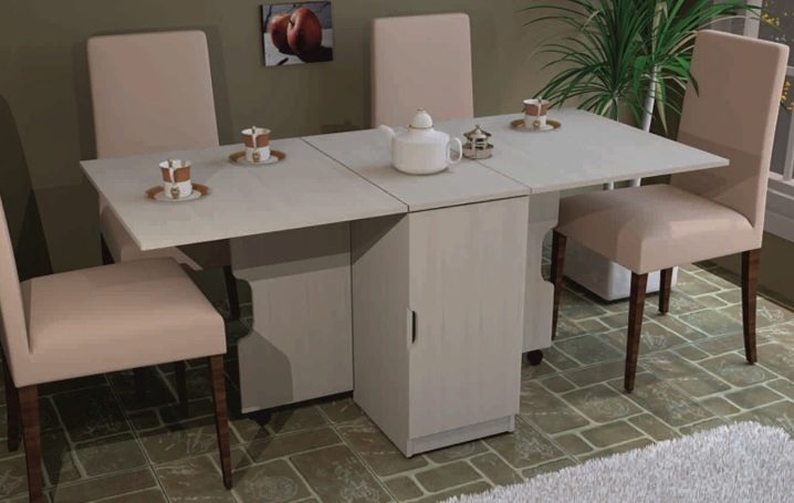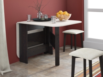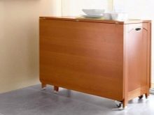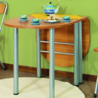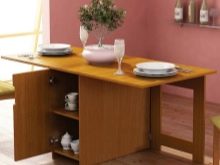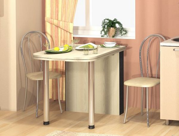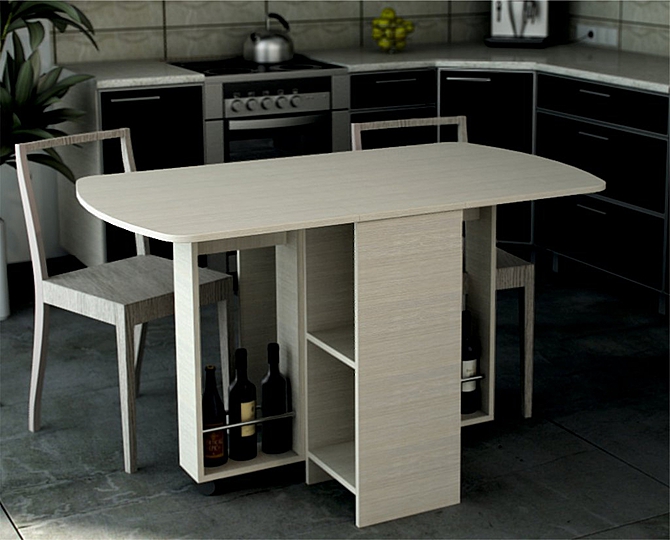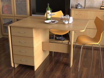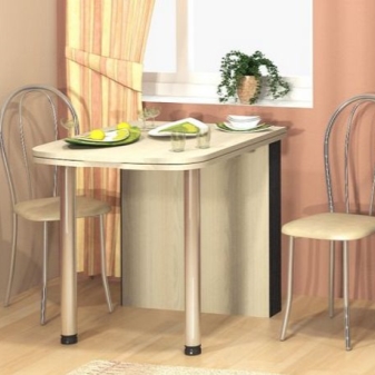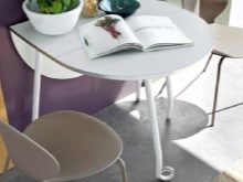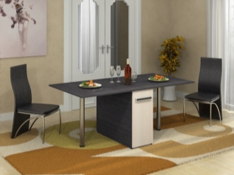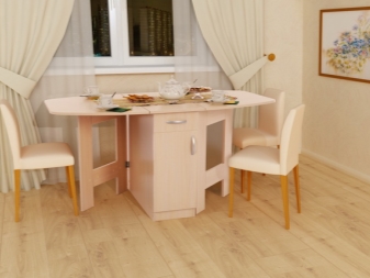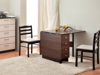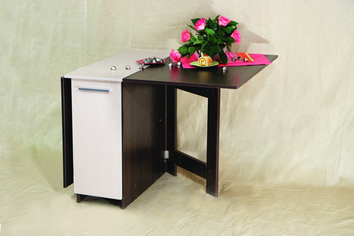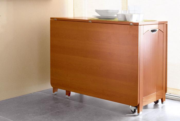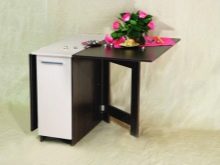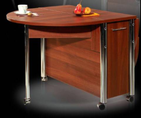 Die Herrinnen der kleinen Küchen bevorzugen es, die Tischkommode zu benutzen, da sie den minimalen Raum einnimmt, ohne die Herrin der Bewegungsfreiheit einzuschränken. Die Mädchen sagen, dass sie es vorziehen, ein solches Produkt in der Ecke oder neben der Wand zu installieren, und während des Mittagessens verschieben sie sie weg und legen sie aus, um einen großen Essbereich zu schaffen. Daher sind unter ihnen sehr beliebte Modelle auf Rädern, mit denen selbst eine kleine Dame den Tisch an den richtigen Ort bewegen kann.
