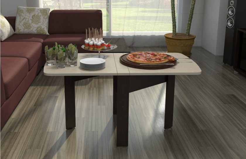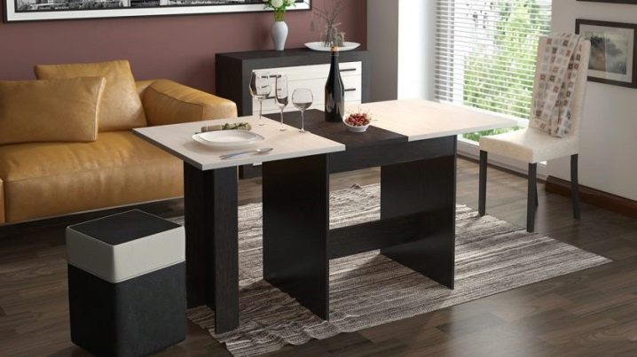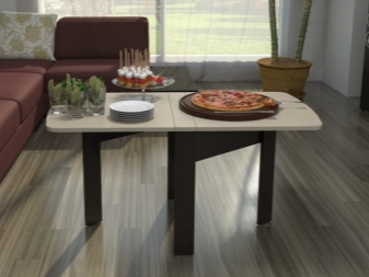Möbelhersteller bieten eine breite Palette von Umwandlungstabellen an, die "Buch" genannt werden. Je nach Nutzungsumfang kann dieser Tisch zum Essen, Arbeiten, Kaffee oder Kochen genutzt werden. Solche Modelle sind nach dem gleichen Prinzip eines Schiebemechanismus kombiniert - eine bewegliche Tischplatte. Meistens ist es in 3 Teile unterteilt.