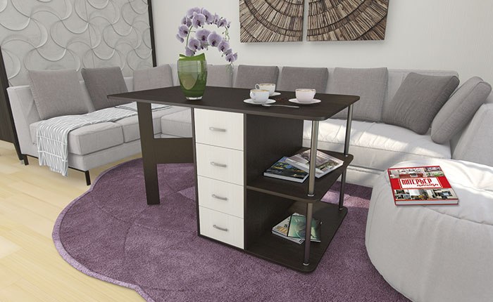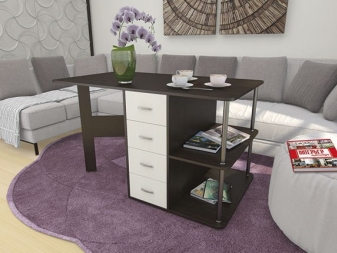 - Tisch mit zusätzlichen Regalen. Das Faltmodell ermöglicht nicht nur die Aufbewahrung verschiedener Kleinigkeiten, sondern auch die Anbringung schöner dekorativer Elemente in den Regalen. Ein solches Produkt schmückt den Raum, in dem es sich befindet.