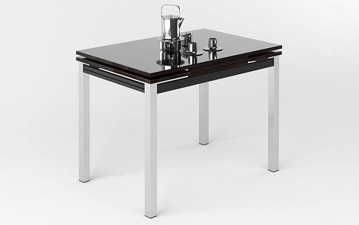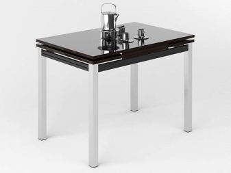 Für das Interieur, mit Stil gemacht High-Teches ist besser, eine massive Struktur auf den Stützrohren zu wählen, und für den Minimalismus ist es im Gegenteil notwendig, dünnere Beine zu wählen. Die Tischplatte kann in jeder Farbe hergestellt werden, aber es ist besser, die üblichen Brauntöne zu ignorieren.
