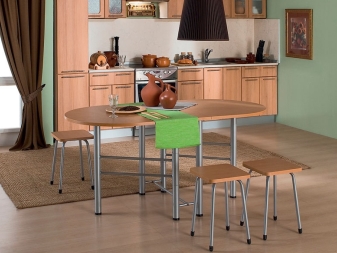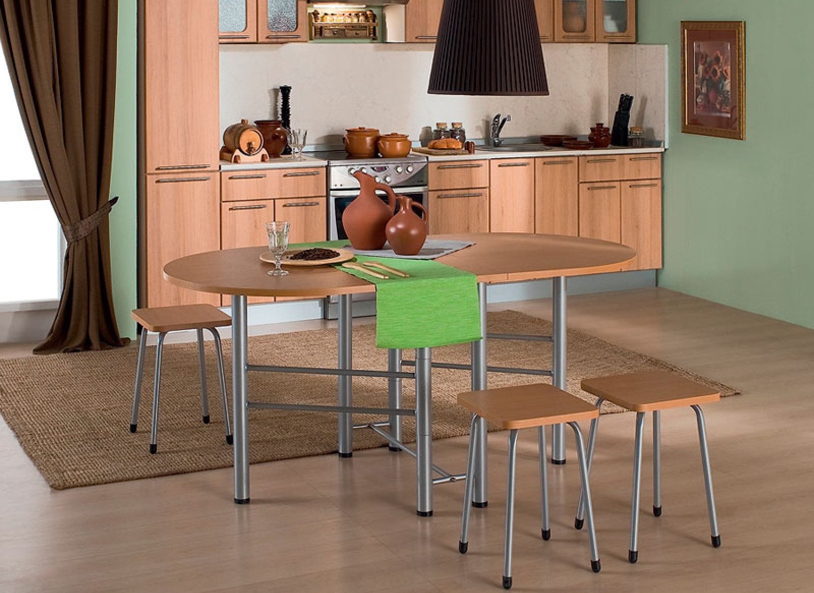 - Mit ovaler oder runder Tischplatte - Ähnliche Produkte wurden von vielen Hausfrauen geliebt, die sich mit kleinen Dimensionen der Küche zufrieden geben. Solche Tabellen ermöglichen es, Speicherplatz zu sparen. Dies gilt insbesondere für kleine Räume. Darüber hinaus ist der Tisch in Form eines Ovals oder eines Kreises eine großartige Lösung für eine Familie mit kleinen Kindern. Solch ein Produkt ist frei von scharfen Ecken, was die Verletzungsgefahr verringert.