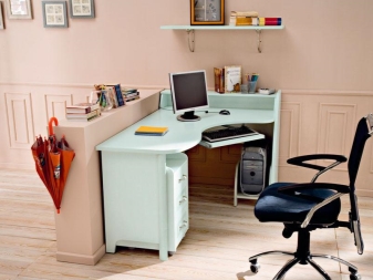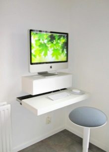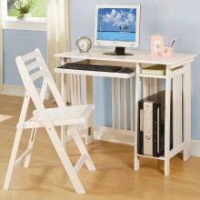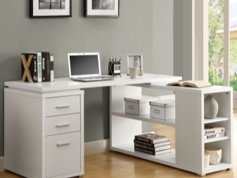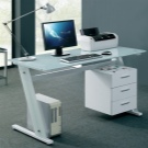 Weiße Computertische können von beliebiger Form sein. Grundsätzlich werden sie durch eine direkte oder eine Winkelmodifikation dargestellt. Die Tischplatte kann entweder geschnitzt oder rechteckig sein. Ergonomische Modelle haben einen runden Halsausschnitt.