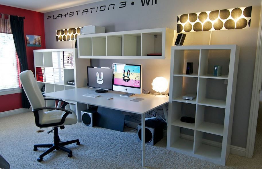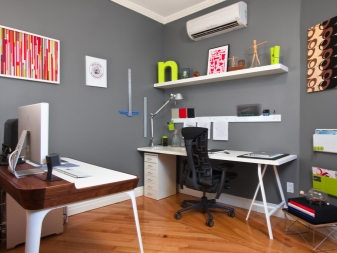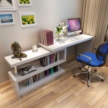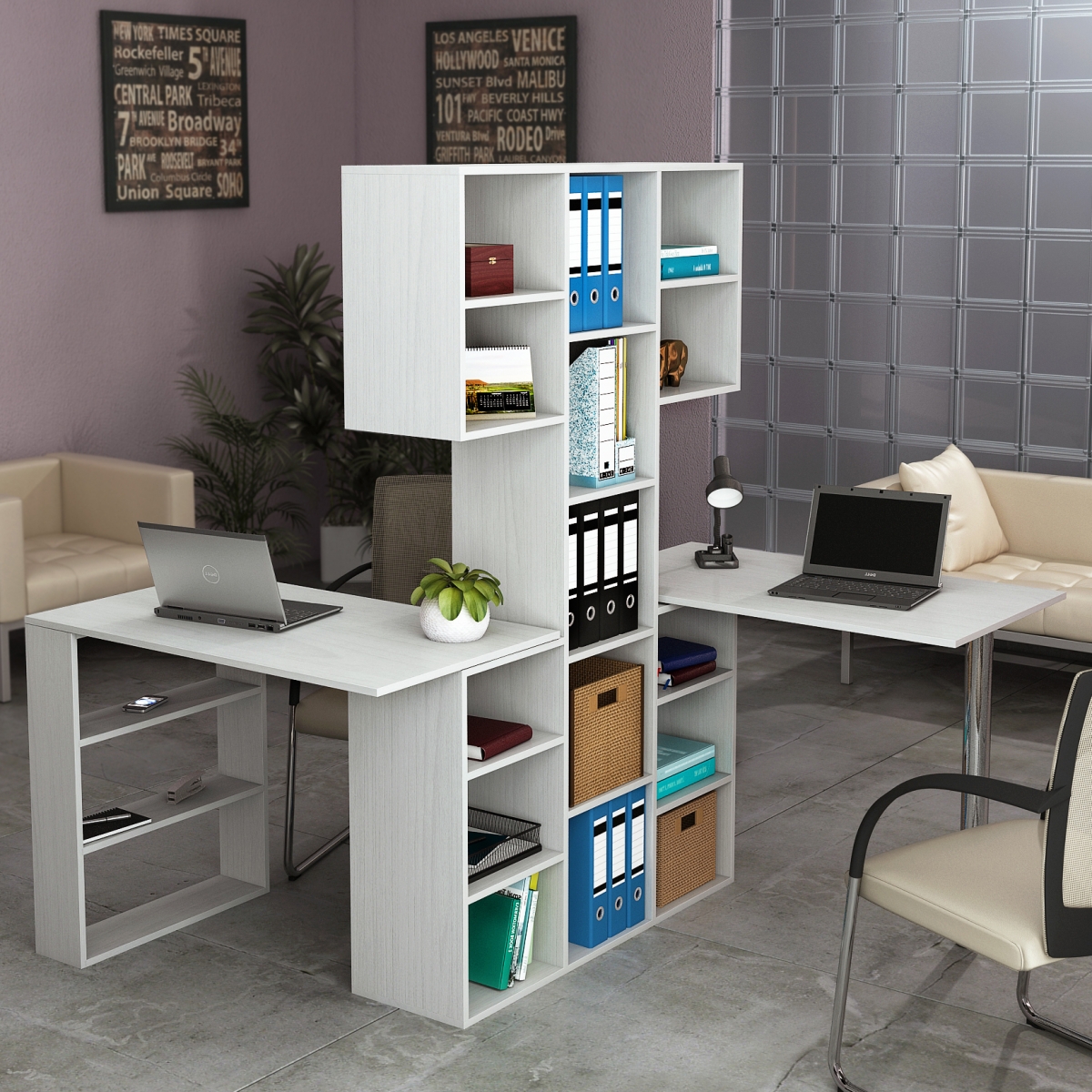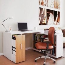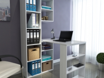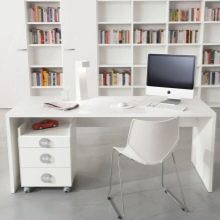 Eine einzigartige Lösung für die Schaffung eines Arbeitsplatzes für zwei ist das Modell, das zwei weiße Computertische enthält, die durch ein kleines Regal verbunden sind. Offene Regale helfen Ihnen, alle Gegenstände und Dinge bequem zu arrangieren. Das ursprüngliche Tabellenlayout benötigt etwas freien Speicherplatz. Kompaktheit und Funktionalität - die wichtigsten Vorteile eines solchen Produkts.