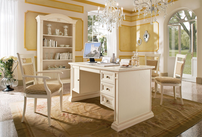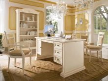 Klassisches Ambiente "liebt" Anmaßung und leichten Bombast. Für ein solches Interieur werden Möbel verwendet, ergänzt mit verschiedenen dekorativen Elementen und Einsätzen, die teure Materialien und Metalle imitieren. Zum Beispiel können Sie für einen hellen Raum einen Tisch in Elfenbein wählen.