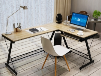 Wenn Sie einen separaten Arbeitsplatz in Ihrem persönlichen Konto ausstatten möchten, aber es hat eine kleine Fläche, dann ist es besser, ein L-förmiges Eckmodell aus Holz zu installieren. Es ist funktionell in der Ecke und nimmt gleichzeitig etwas Platz gegenüber dem ganzen Raum ein. Aber wenn Sie einen solchen Tisch in einer Einzimmerwohnung installieren, dann versuchen Sie, sehr kompakte Modelle zu kaufen, die mehrere Funktionen gleichzeitig kombinieren.So können Sie Modelle auf Rädern oder bequeme modulare Tische mit einem Überbau bevorzugen. Es ist besser, wenn dieses Produkt mit einem Regal, mit Schubladen oder mit Regalen sein wird. Eine solche Füllung ermöglicht es, den Arbeitsplatz auszustatten und ihn funktioneller und bequemer zu machen.