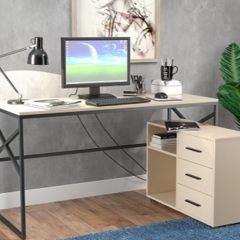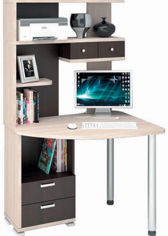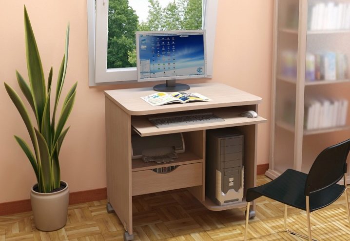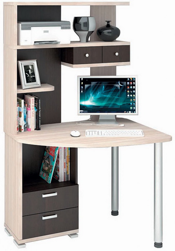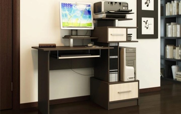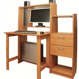 Solche Designs sehen klassischen Desktops sehr ähnlich, sind jedoch kompakter und benötigen weniger Platz. Das sind sehr lakonische Designs, die weniger unterschiedliche Funktionen haben, aber verschiedenartige Inhalte in Form von Regalen, Boxen. Ein solcher kompakter Tisch wird in der Regel in Form eines Ständers für einen Monitor und eines Blockes für eine Tastatur dargestellt. Einige Modelle enthalten auch Schubladen rechts von der Tastatur und einige zusätzliche Regale, auf denen der Drucker platziert werden kann.