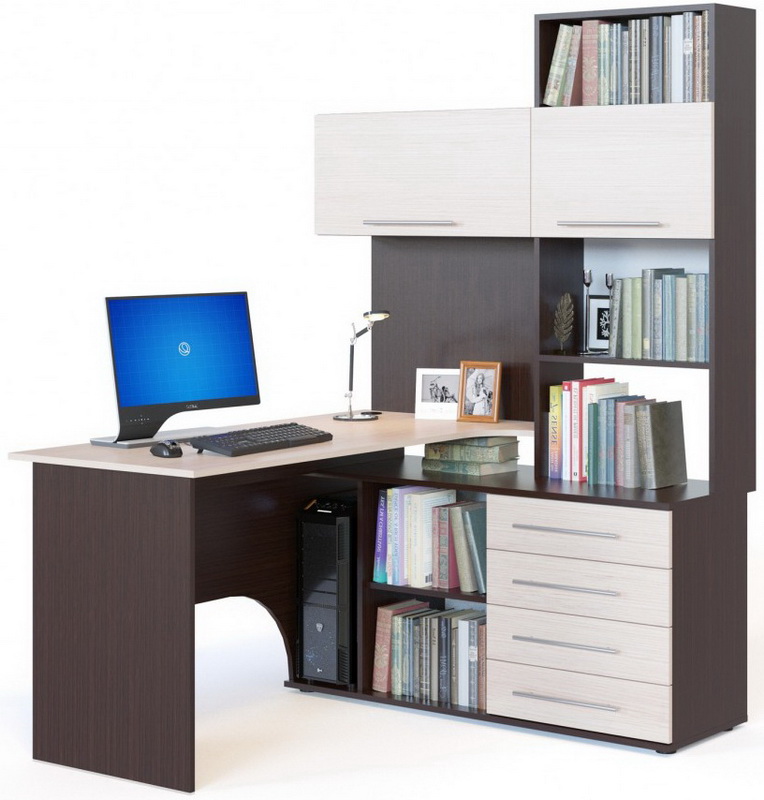 Für klassischere Interieurs werden Perlweiß, Beige, Hellgrau, Pfirsich und Milchschattierungen ausgewählt. Für eine strenge Büroumgebung ist ein klassischer Holztisch im passenden Farbton oder ein dunkles Wenge-Farbmodell besser geeignet. Für den Bürogebrauch und dunkle Designs, wie Schwarz, Grau und Dunkelbraun. Ein solcher Arbeitsplatz ist optisch kompakter.