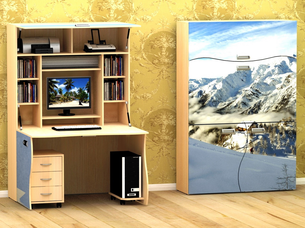 Diese Tabelle bietet die Möglichkeit, den Arbeitsplatz zu transformieren. Darüber hinaus haben die Hersteller eine große Anzahl möglicher Optionen zur Verfügung gestellt. So gibt es ein sehr praktisches, kleines Modell, das sich im Schrankbereich befindet. Das heißt, in einer der Abteilungen des Büros ist die Tischplatte befestigt, auf der der Monitor installiert ist, und die Systemeinheit ist in einer anderen Zelle angeordnet. Die zweite Version des konvertierbaren Computertisches ist eine Schiebewand. Diese Tische haben einen separat montierten Monitorständer, die darunter liegende Tischplatte ist nicht vollständig fixiert. Es kann gedreht werden, Befestigung in einer für Sie bequemeren Position.Auch unter dem Regal für die Tastatur, die Sie auch verschieben können.