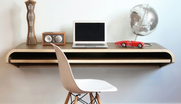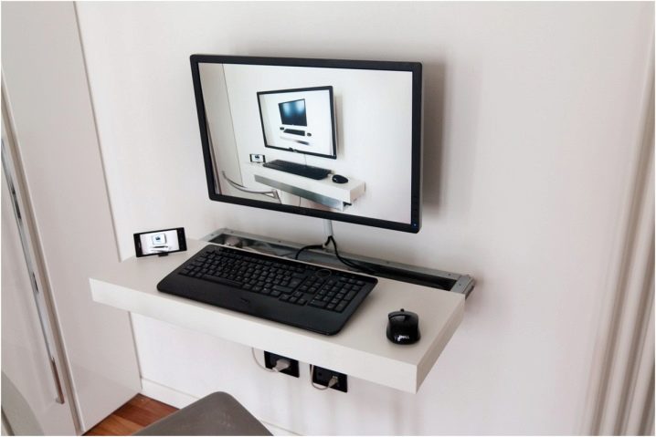 Dieses Produkt kann sogar an der Wand angebracht werden. Es ist fest zusammen mit der Tischplatte und zusätzlichen Regalen montiert. Eine solche Struktur kann eine Überstruktur und viele offene Regale aufweisen. Es kann nicht nur den Computer und die notwendigen Dinge dafür unterbringen, sondern auch andere Schmuckstücke. In der Regel werden solche Computertische für die Einrichtung modernerer Innenräume verwendet. Sie sind sehr kompakt und benötigen wenig Platz. Da sie während der Installation montiert werden, ist ihre weitere Umgestaltung ziemlich kompliziert.