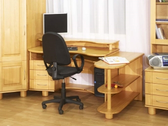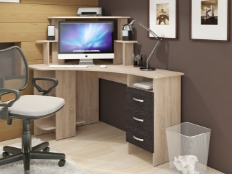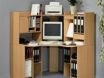 Dies ist eines der erfolgreichsten Beispiele für eine Eckentabelle für die Arbeit an einem Computer. Dieser Entwurf erlaubt Ihnen, Raum im Raum rationell zuzuordnen, mit einer großen Anzahl von Regalen macht es möglich, einen Platz für alle notwendigen Papiere und Zusätze zu finden.