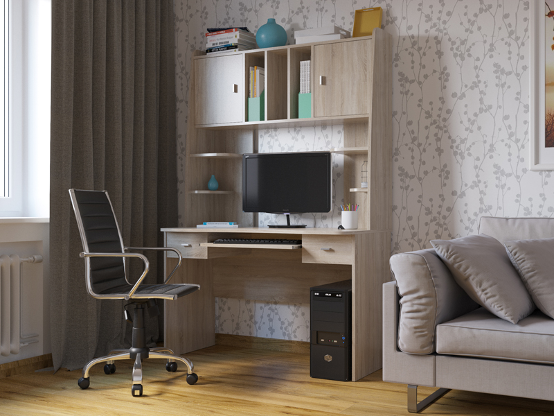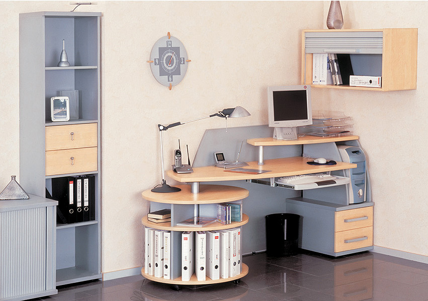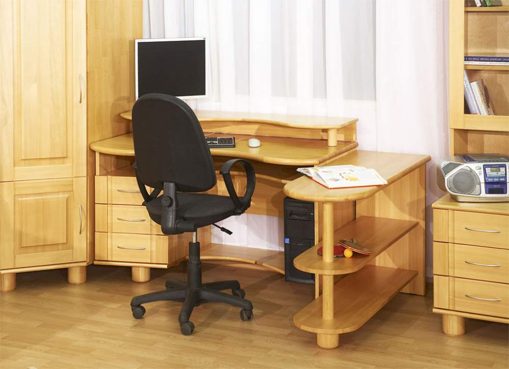 - Platzsparend. Seltsamerweise ist es dieses Design von Möbeln, das die effizienteste Nutzung von freien Quadratmetern hilft. Sie brauchen kein Zubehör an verschiedenen Orten im Raum, denn sie werden in speziell dafür entworfenen Kisten für sie und in den Regalen aufbewahrt. Dies ist sehr praktisch, wenn es um kleine Wohnungen geht, in denen es unmöglich ist, einen separaten Raum für das Büro zu reservieren. Mit einem solchen Computertisch haben Sie einen vollen Arbeitsbereich.