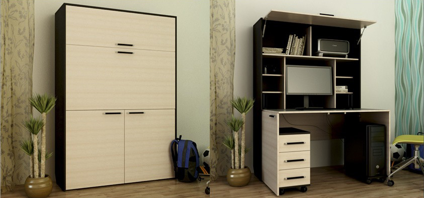 - Transformator. Diese Probe ist auch nützlich für diejenigen, die durch den Meter der Wohnung begrenzt sind. Das Design beinhaltet das Vorhandensein von Faltteilen, zum Beispiel kann die Tischplatte nach Bedarf geneigt und geschlossen werden, oder die Regale können nach Ihren Wünschen gefaltet werden. Konfigurationsoptionen sind riesig. In den Katalogen moderner Möbelfabriken präsentierte sich eine große Auswahl an Modellen für jeden Geschmack und Geldbeutel.