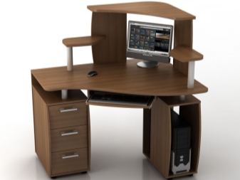 Bei der Wahl eines eckigen Computertisches mit einem Rack ist es sinnvoll, auf einen speziellen Monitorständer zu achten, mit dem Sie den Bildschirm über dem Tisch leicht anheben können und darunter einen Freiraum bilden. Die optimale Größe des Standes beträgt 40x40 cm und die Höhe des Aufstiegs beträgt 10-15 cm.