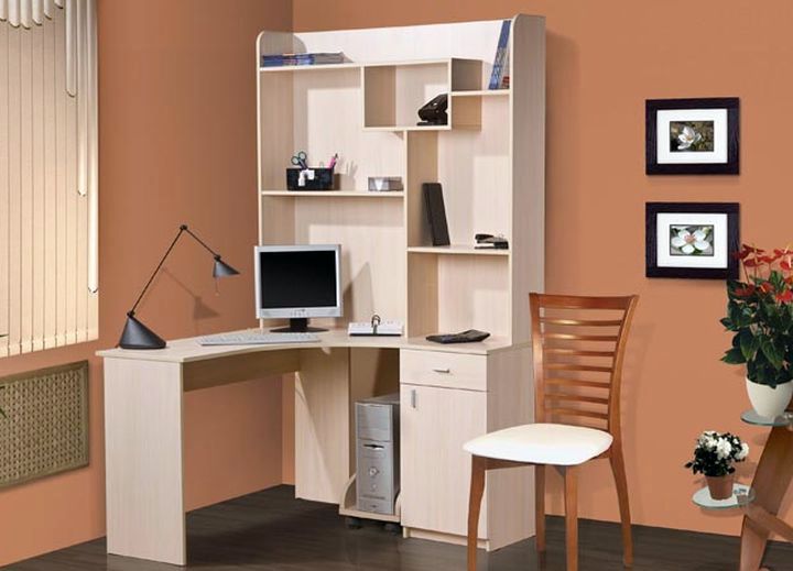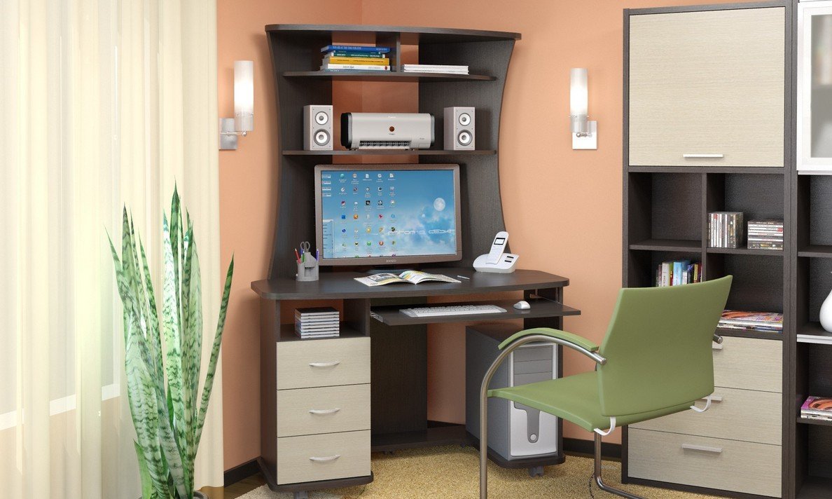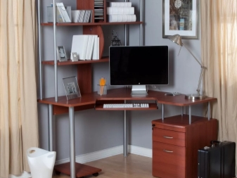 Corner Computer Desk mit einem Rack ist die beste Lösung für die Organisation des Arbeitsplatzes. Bevor Sie es kaufen, müssen Sie jedoch den Standort in der Wohnung bestimmen. Es ist wichtig, die Fläche des Raumes, seine Anordnung, die Anzahl und Anordnung der Fenster und den Stil des Innenraums zu berücksichtigen. Das ausgewählte Modell sollte in jeder Hinsicht in den zugewiesenen Raum passen, einschließlich der Farbgestaltung des Raums.