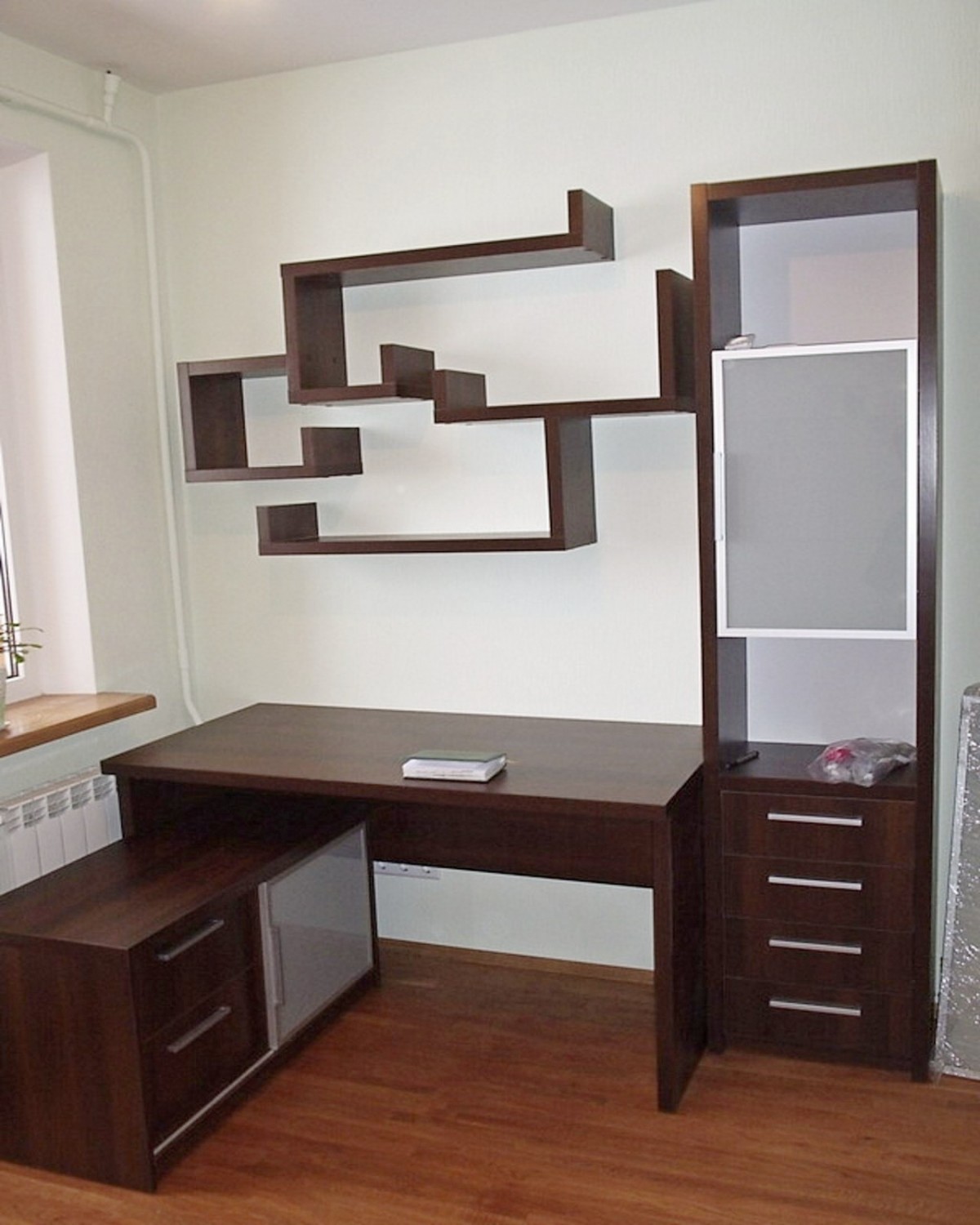 Es ist möglich, das Rack auf dem Boden neben dem Computertisch anzuordnen, und Sie können es über die Arbeitsfläche hängen. Mit Hilfe von Ebenen können Regale ungewöhnlich sein, um den Arbeitsbereich zu dekorieren.