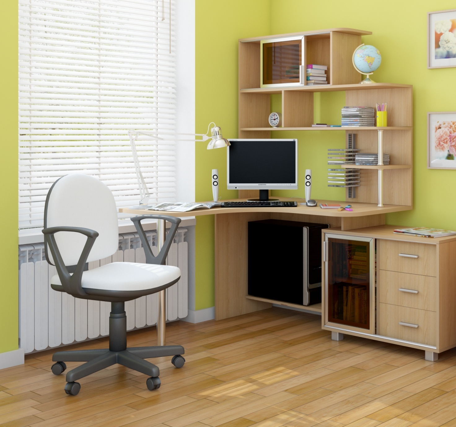 Die Anordnung der Möbel wird auch durch zusätzliche Elemente beeinflusst. Der Computertisch an der Ecke wird komplett mit einem Gestell, einem Ständer für die Systemeinheit und einer Schublade mit Schubladen geliefert, so dass Sie den optimalen Platz dafür finden müssen.