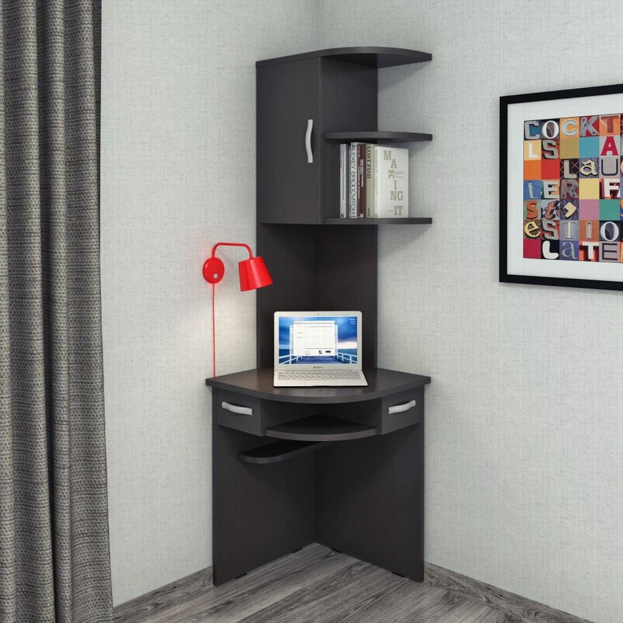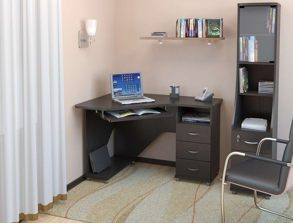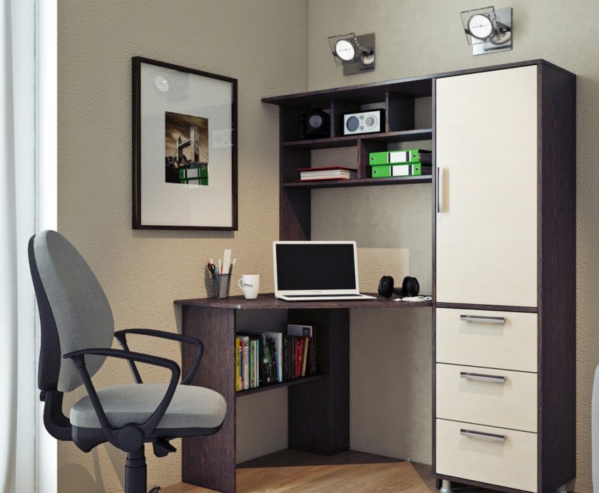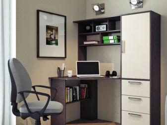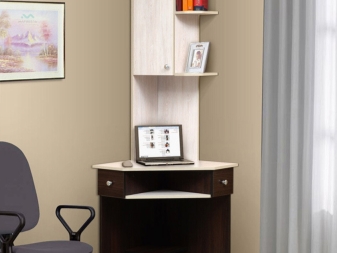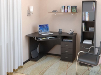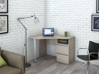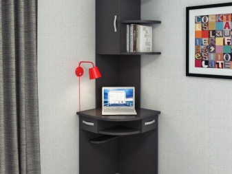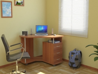 - Ein kleiner Tisch mit einem Regal und einer Schublade (zum Aufbewahren von Büchern und Heften) ist auch für ein Kinderzimmer geeignet. Aus Materialien ist es besser, einen Baum wegen seiner Umweltfreundlichkeit und Nachhaltigkeit zu wählen. Die Winkelposition gibt übrigens zusätzliche Sicherheit, da sich die scharfen Ecken direkt an der Wand befinden und es für Kinder schwierig wird, sich an ihnen zu verletzen.