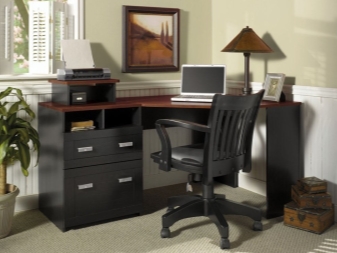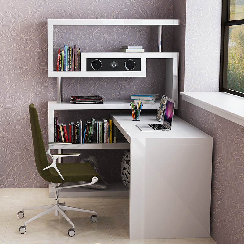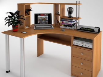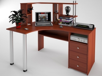Die zweite Option ist viel funktionaler. - es kann mit allen Zusätzen ausgestattet werden, die dem Tisch zusätzlichen Komfort während des Gebrauchs geben, obwohl es groß ist und nicht für einen kleinen Raum oder Büro geeignet ist. Auch wenn Sie einen eckig diagonal positionierten Tisch wählen, können Sie einen zusätzlichen Vorteil in Form von zusätzlichen Regalen gewinnen, indem Sie mehrere Regale über die Tischplatte und nicht an den Seiten anbringen.