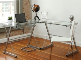 Je nach Interieur können Sie Ecktische aus Aluminium (sie sind sehr leicht und für ein Büro geeignet), Hartglas, MDF oder Spanplatten aufnehmen. Es gibt auch kombinierte Optionen wie Metall und Glas. Die Form der Tabellen ist in lineare und geometrische (z. B. gerundete, wellige Formen), primitive und mehrstufige Formen unterteilt.