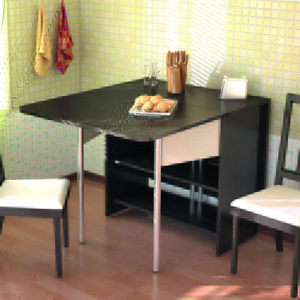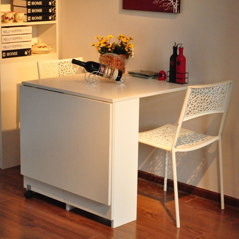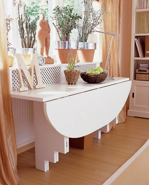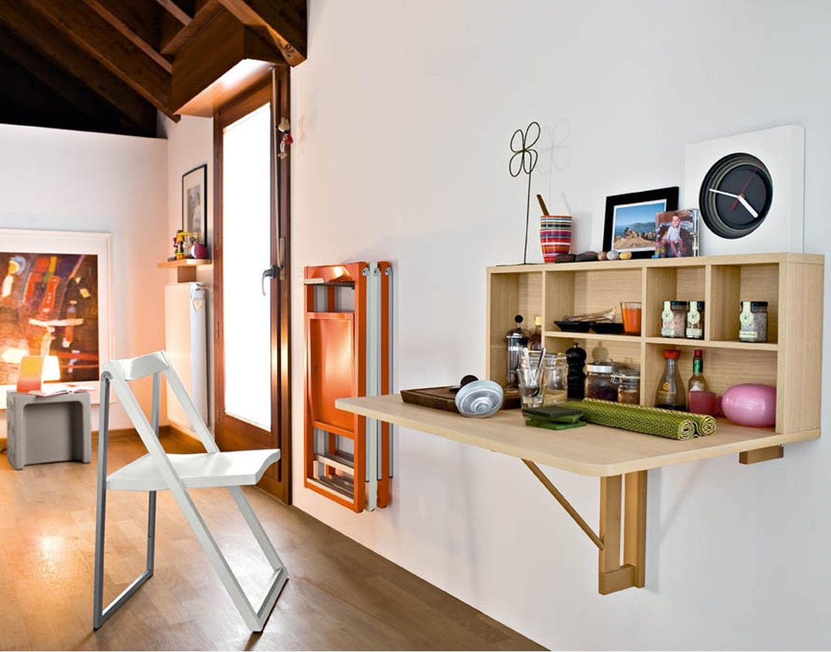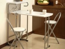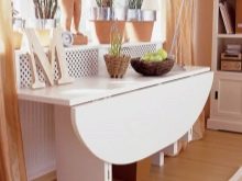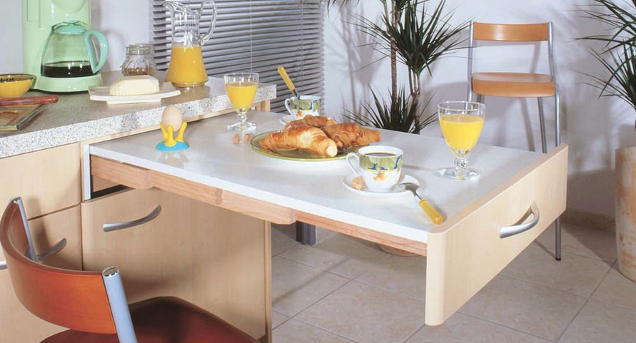 Wenn Sie im Wohnzimmer auf einen Tisch verzichten können, dann ist dieses Möbelstück für die Küche einfach notwendig. Für kleine Räume sind Klapptische ideal. Wenn sie gefaltet sind, können sie die Funktionen eines kleinen Regals oder eines echten Bildes übernehmen oder sie können einfach mit der Wand verschmelzen, ohne Aufmerksamkeit zu erregen.