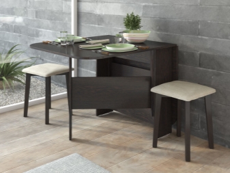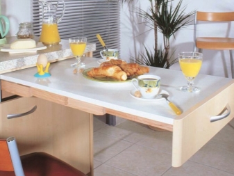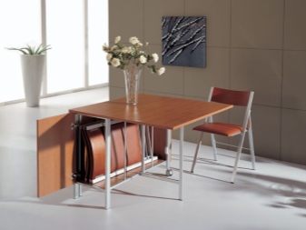 Meistens werden diese Modelle als Esstische verwendet. Solche Möbel sind eine Struktur, die aus drei Oberflächen besteht. Ein kleiner Tisch kann zu einem großen Esstisch werden. Moderne Designer haben Designs entworfen, in denen Klappstühle versteckt werden können. So können Sie leicht alle unnötigen Dinge verstecken, und wenn die Gäste ankommen, wird es auf jeden Fall genug Platz für alle geben.