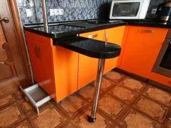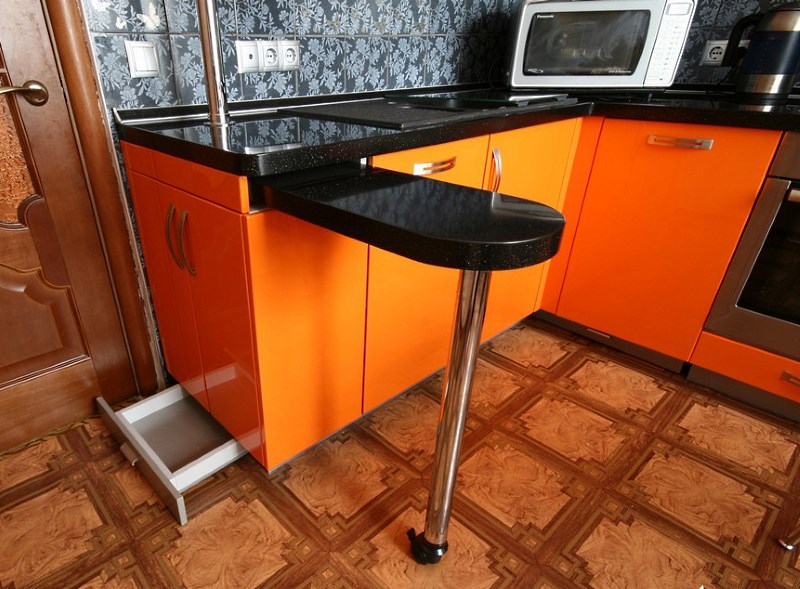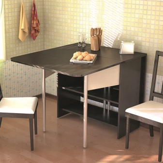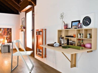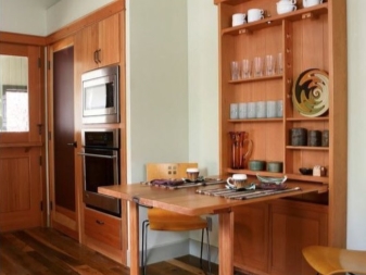 Hersteller haben Möglichkeiten zum Falten von Regalen für Küchen und Esszimmer zur Verfügung gestellt. Dieses Format beinhaltet die Transformation der Struktur in einer komfortablen Bar.