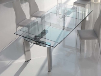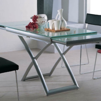 Der Tisch mit einer Glasplatte nimmt praktisch keinen Platz und verleiht Raum Leichtigkeit und Luftigkeit. Aufgrund seiner neutralen Farben passt das Produkt perfekt in den Innenraum, unabhängig davon, welche Farbpalette im Raum vorherrscht.In der Regel wird die Glasplatte durch langlebige Metallbeine ergänzt. Dies ist sehr praktisch, da eine solche Tabelle Passen Sie sich leicht in das Design des Raumes im Stil von High-Tech.