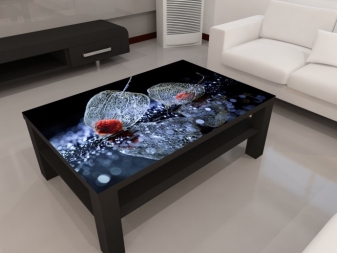Es gibt viele stilistisch unterschiedliche Varianten. Neben einfachen transparenten Tischen gibt es auch Modelle, die mit Fotodruck, exquisiten Malereien oder anderen dekorativen Elementen dekoriert sind. Dies ermöglicht es, Möbel zu wählen, die zu allen Stilen passen.
