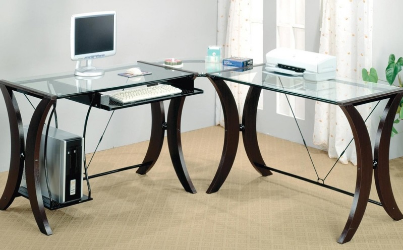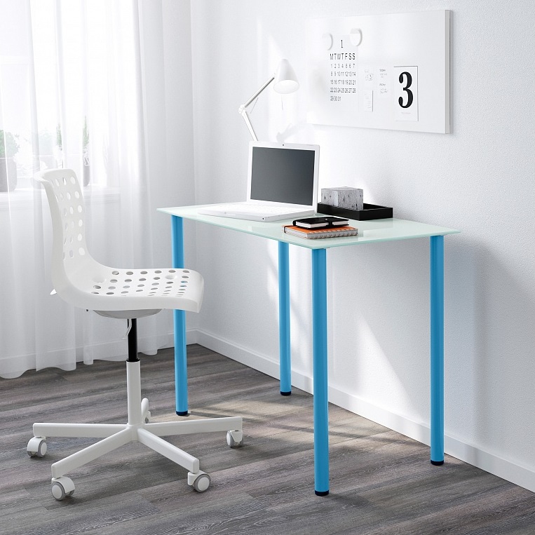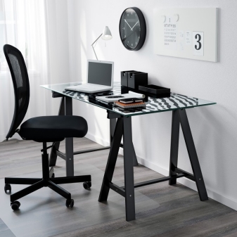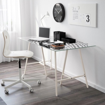 Die Arbeitsecke kann auch stilvoll aussehen und eine ungewöhnliche Glasoberfläche haben.Im Zimmer eines modernen Teenagers und sogar eines Erwachsenen, der zu Hause arbeitet, wird eine solche stilvolle Lösung sehr cool aussehen. Sie können einen Tisch mit einem massiven Stuhl auf Rädern und schöne dekorative Elemente, wie eine moderne Lampe und eine Vase mit Blumen hinzufügen.