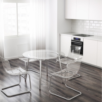 Auch die Glasoberfläche des Tisches erfordert ständige Pflege. Das bedeutet, dass Sie das Glas ständig von Krümel, Staub, Fingerabdrücken und Spuren von Tassen abwischen müssen. Vor dem Hintergrund von transparentem Glas ist all dies sehr auffällig und verwöhnt nicht nur das Aussehen des Tisches selbst, sondern auch den Raum, der sofort unordentlich wirkt.