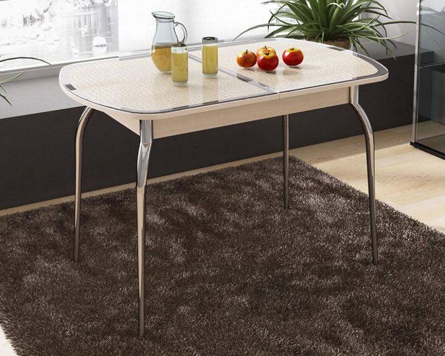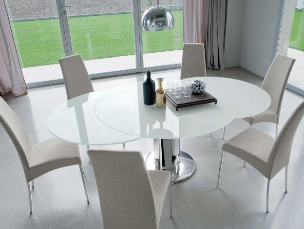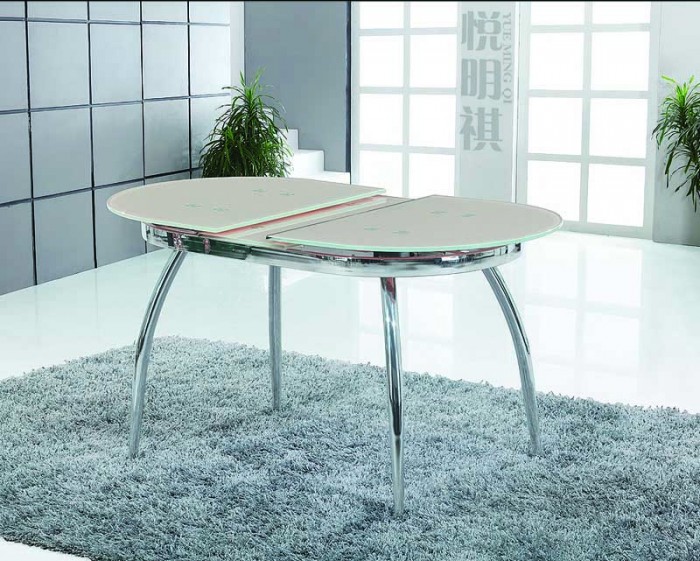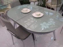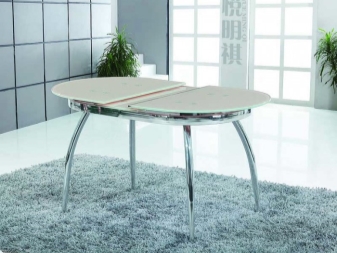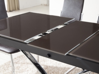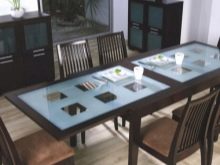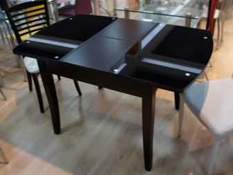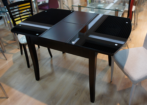 In einem anderen Fall bleibt die Höhe gleich, aber aufgrund des Gleitmechanismus erhöht sich die Anzahl der Sitze. In diesem Fall kann der Einsatz entweder Glas oder aus einem anderen Material oder einer anderen Farbe sein. Mit dieser Umwandlung wird der runde Tisch oval und das Quadrat - rechteckig.