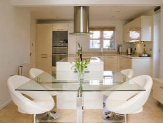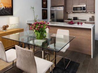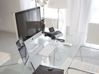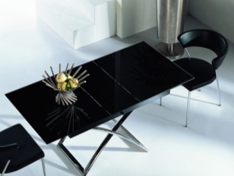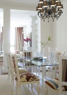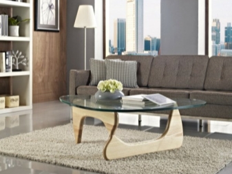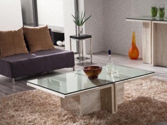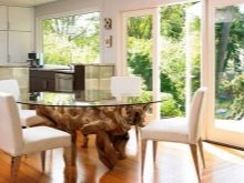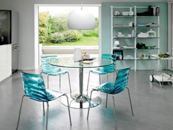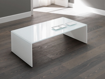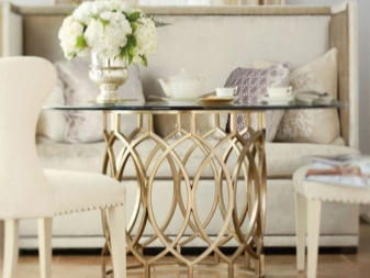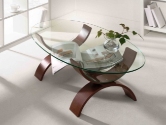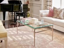 Der Tisch ist kein Möbelstück, vom Rest des Interieurs abgeschnitten. Es bedeutet, dass man über die Designdekoration nicht nur des Produktes selbst, sondern auch des umgebenden Raumes nachdenken muss. Darüber hinaus können Sie mit der transparenten Tischplatte aus Glas auf die Basis und den Support achten.
