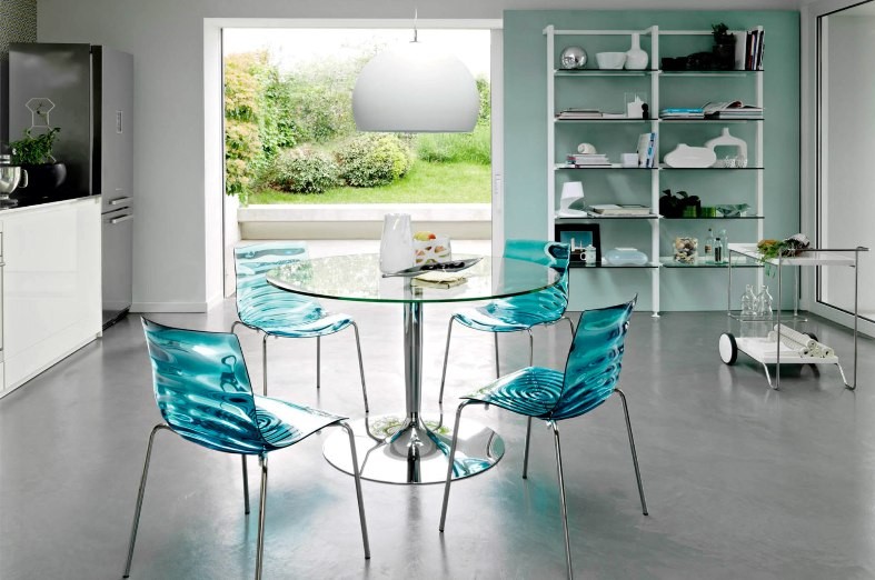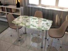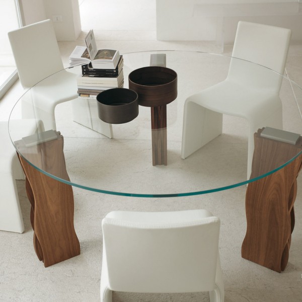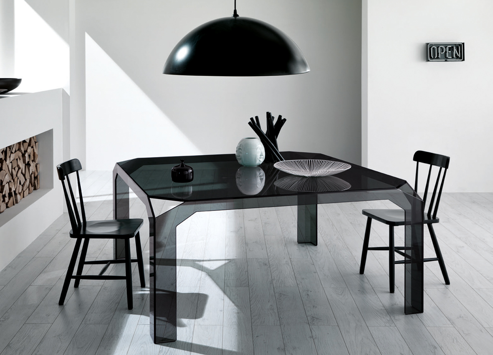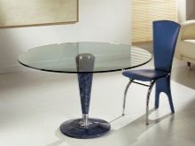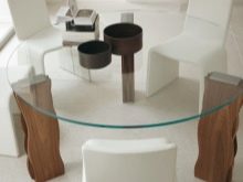 Monolithtische Tische sind als Abendessen für eine große Anzahl von Menschen schwer vorstellbar. Obwohl die Designidee nicht still steht. Vielleicht gibt es solche Tische. Meistens erfüllen sie immer noch eine dekorative Funktion. Natürliche grünliche Farbe, entweder farblos, matt oder von hell gefärbtem Glas Lacobel; in der Form des Buchstaben "P", "S", einer Welle, einer Blume - eine unglaubliche Vielfalt von Formen. Bei der Herstellung von Technologie kann Triplex oder gebrauchte Fotodruck angewendet werden.