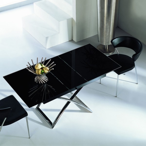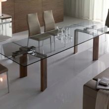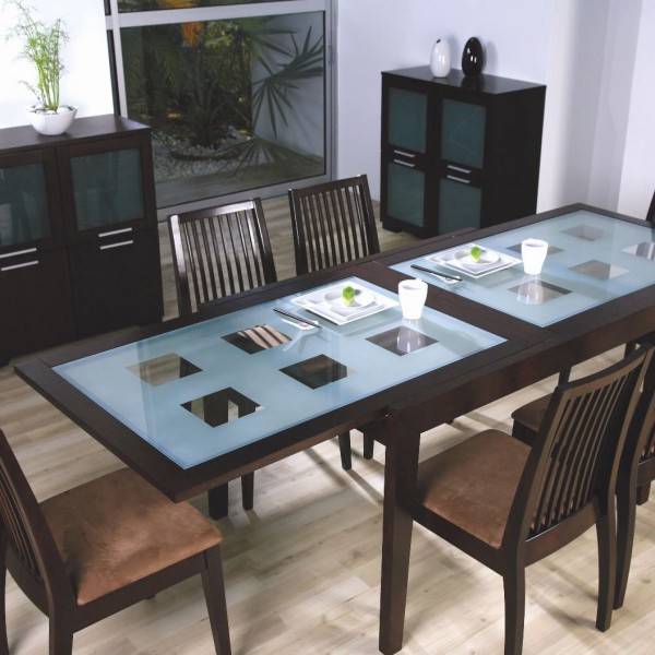Dank der Erweiterungssysteme kann die Tischplatte aus Glas mit Holz- oder Kunststoffeinsätzen hergestellt werden.