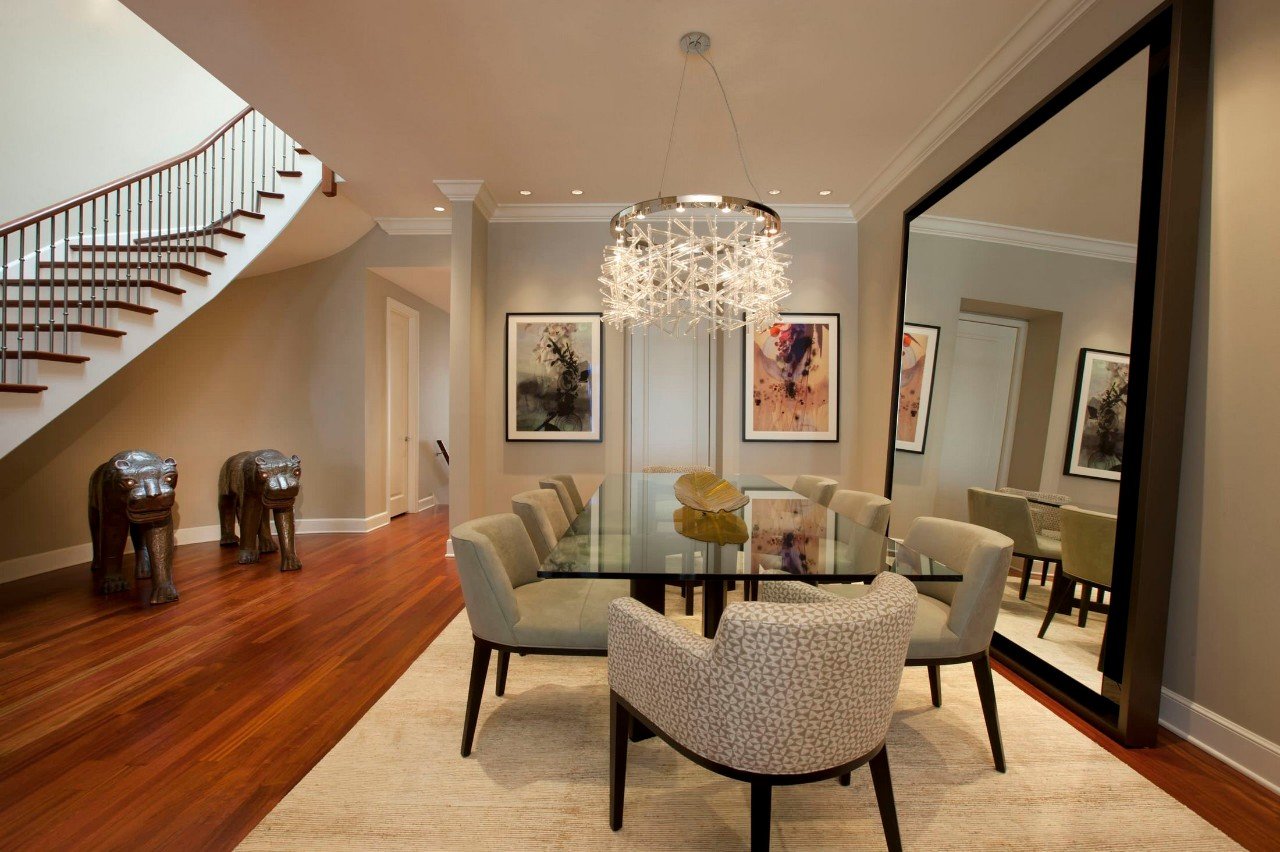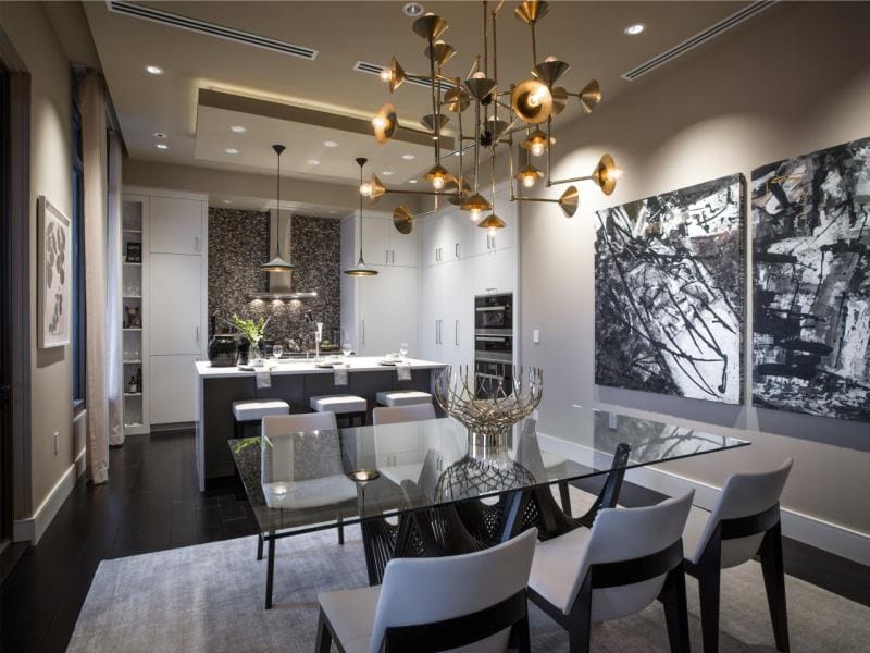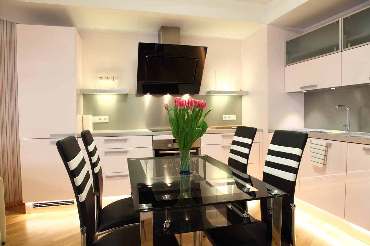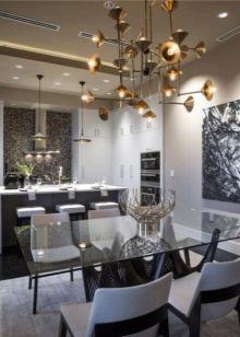 Wenn ein glänzender Tisch unter einen Kronleuchter gestellt wird, vergrößert das reflektierte Licht die Fläche einer kleinen Küche oder einer kleinen Halle. Außerdem erfordert diese Beschichtung keine Tischdecken. Es ist festlich an sich.