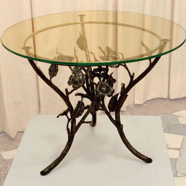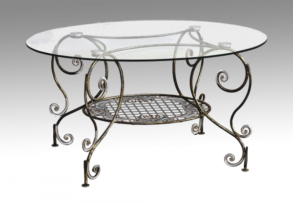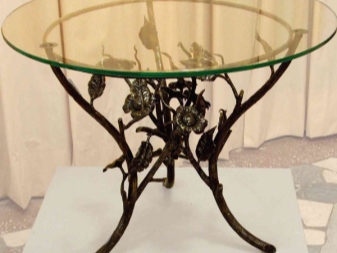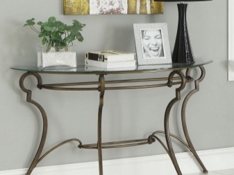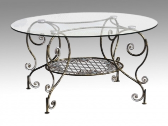 Aber es ist nicht nur die Farbe. Das ausgewählte Material ist wichtig. Mit Mühe, aber Sie können sich in einem kleinen Haus einen Glastisch auf einem geschmiedeten Bein vorstellen. In den Wohnungen werden solche Möbel mit schmiedeeisernen Details kombiniert mit einem Kronleuchter mit Schmiedearbeiten gut aussehen.