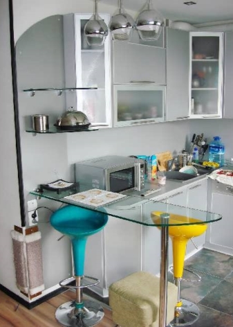 Für Nicht-Glas Küchentische, eine vertraute Konstruktion mit Zellen (für Löffel, Gabeln, und so weiter). In den Glastischen sehen solche Kästen unästhetisch aus. Aber im Keller können Sie Metallzellen bauen, die als Bar dienen. Oder in den Behältern lakobel Früchte setzen.