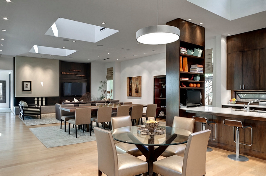 Moderne Bewunderer werden einen monolithischen Tisch aus dunklem Glas oder einen Spiegelfilm bevorzugen. Es wird definitiv das Herzstück des Wohnzimmerdesigns sein.