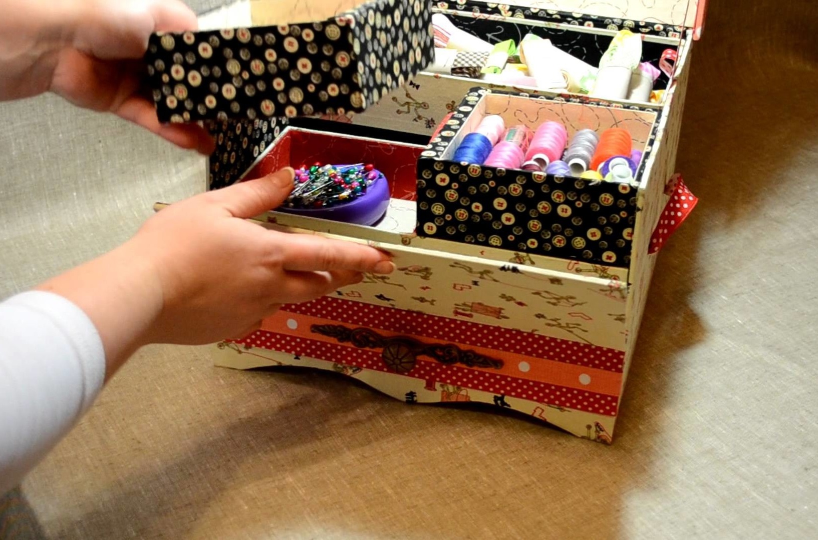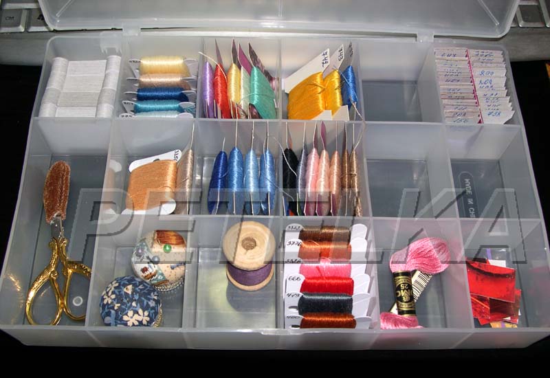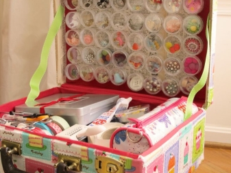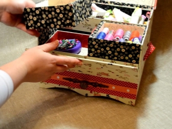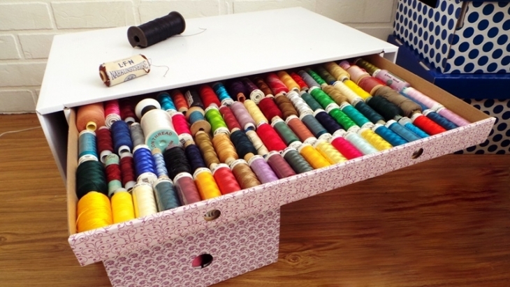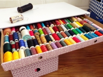 Ergänzen Sie den Arbeitsplatz mit mehreren Boxen, Boxen und Ordnern für Kleinigkeiten. So wird jeder Artikel an seinem Platz sein und Sie müssen nicht für eine lange Zeit nach den notwendigen Threads oder Pins suchen. So können Sie sich so gut wie möglich auf Ihre Arbeit konzentrieren.